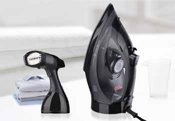 • żelazko o mocy 2200 W: płynna regulacja temperatury; pojemnik na wodę o poj. 350 ml; aluminiowa stopa żelazka; funkcja jonizacji pary oraz funkcja samoczyszczenia • składana parownica do ubrań: zintegrowany zbiornik na wodę; z nasadką szczotkową
