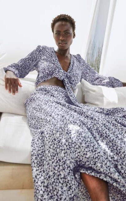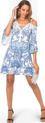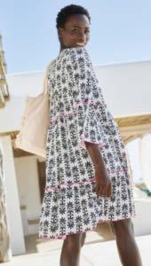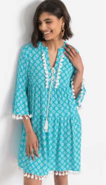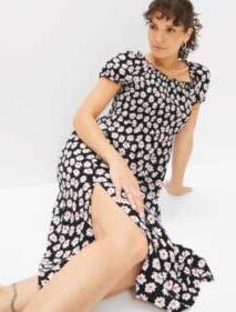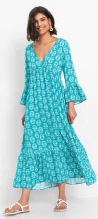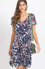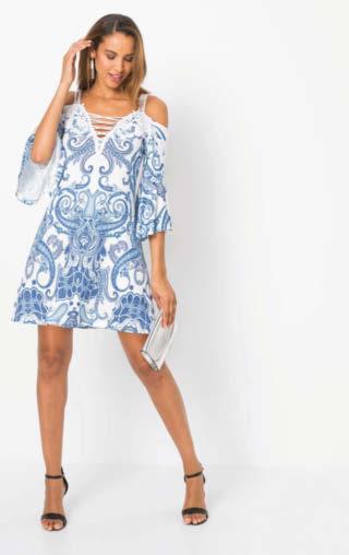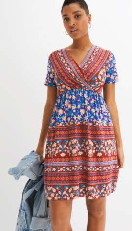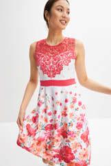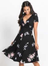 01 | Sukienka z dżerseju z nadrukiem, 109,99 zł Bardzo kobieca sukienka z dżerseju w kwiatowy deseń, w dopasowanym fasonie z krótkim rękawem, okrągłym dekoltem i poszerzaną częścią spódnicową. Z wygodnego materiału z elastanem zapewniającego świetne dopasowanie do figury. Dł. w rozm. 40/42 ok. 100 cm. 95% wiskoza, 5% elastan.