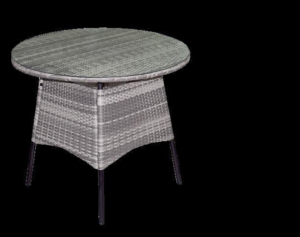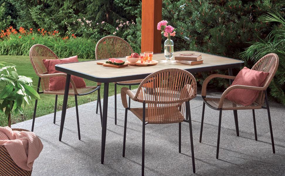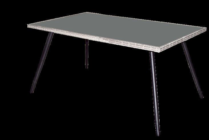 Zestaw Isla 4-osobowy stół: wym. 160 x 90 x wys. 72 cm blat: szklany, malowany na imitację drewna stalowy stelaż fotel: wym. 60 x 57 x wys. 84 cm sznurek polietylenowy