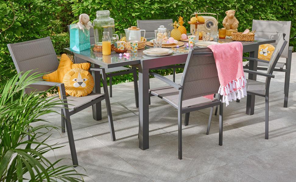 Zestaw Tacoma 6-osobowy stół rozkładany: wym. 140/200 x 90 x wys. 75 cm blat: szklany, kolor: szary aluminiowy stelaż