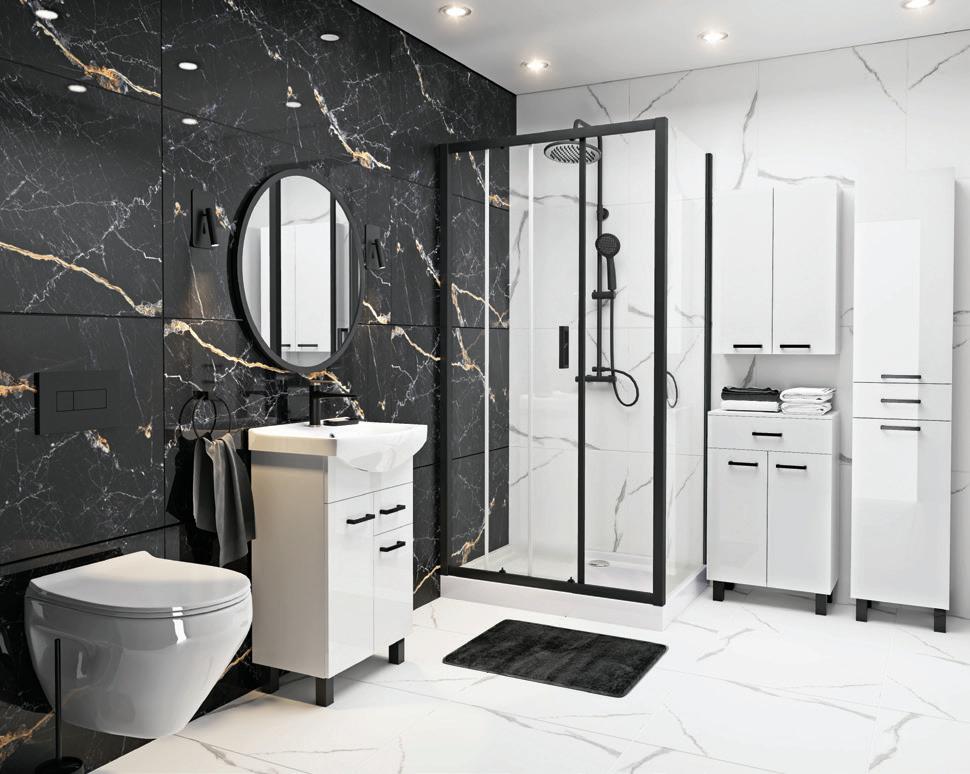 Kabina prysznicowa Doris Black - 1299,- wym. 100 x 80 x 200 cm, szkło transparentne hartowane: 5 mm, profil: czarny, mozliwość montażu prawo- lub lewostronnego brodzik polski, wys. 15 cm 2. Zestaw prysznicowy Vivo Black z baterią - 419,- kolor: czarny, mat, skład zestawu: bateria mieszaczowa, drążek prysznicowy, słuchawka, wąż, deszczownica, HOT CENA w dn. 12-15 lipca - 389 zł 3. Szafka stojąca Novelty z umywalką - 299,- wym. 50 x 85 x 43 cm, kolor: biały, korpus i fronty lakierowane, zestaw nie zawiera armatury 4. Szafka wisząca Novelty - 179,- wym. 50 x 71 x 22 cm, kolor: biały, korpus i fronty lakierowane, półka w zestawie 5. Szafka stojąca Novelty - 269,- wym. 50 x 83 x 30 cm, kolor: biały, korpus i fronty lakierowane, półka w zestawie 6. Słupek stojący Novelty - 349,- wym. 35 x 179 x 30 cm, kolor: biały, korpus i fronty lakierowane 7. Dywanik łazienkowy - 29,99 wym. 45 x 70 cm, kolory: czarny, beżowy