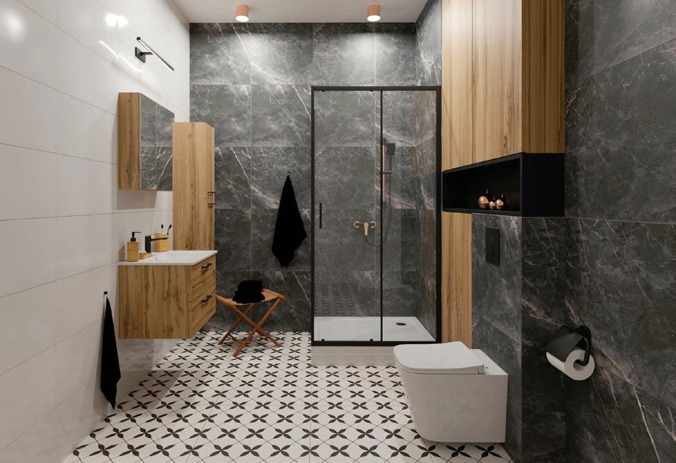 1. Gres szkliwiony Clover Pattern - 59,99/m2 wym. 29,8 x 29,8 cm, kolor: czarno-biały, klasa ścieralności: III, mrozoodporny, op. 1,33 m²/79,79 zł 2. Szafka wisząca Soria z umywalką - 349,- wym. 60 x 46,8 x 46 cm, kolor: dąb, cichy domyk 3. Szafka lustrzana Soria - 189,- wym. 60 x 60 x 13,8 cm, kolor: dąb, cichy domyk 4. Słupek wiszący Soria - 269,- wym. 30 x 130 x 28 cm, kolor: dąb, cichy domyk 5. Akcesoria łazienkowe Hanoi - od 14,99 kolor: jasnobrązowy, materiał: bambus, Kubek kosmetyczny - 14,99 zł, Mydelniczka - 19,99 zł, Dozownik mydła - 29,99 zł 6. Gres szkliwiony Space Blue Micro - 79,99/m2 wym. 59,8 x 59,8 cm, kolor: granatowy, op. 1,07 m²/85,59 zł 7. Kabina prysznicowa Doris Black - 1249,- wym. 100 x 80 x 200 cm, szkło transparentne hartowane 5 mm, profile czarne, możliwość montażu prawo- lub lewostronnego, brodzik polski: 15 cm 8. Zestaw natryskowy na drążku Avangarda - 169,- kolor: czarny/rose gold 9. Zestaw podtynkowy Grohe Domino - 1096,- Miska Merida - odpływ poziomy, bezkołnierzowa - 399,- Stelaż podtynkowy Grohe Solido Start 3w1, czarny przycisk pneumatyczny, ciche spłukiwanie - 697,-