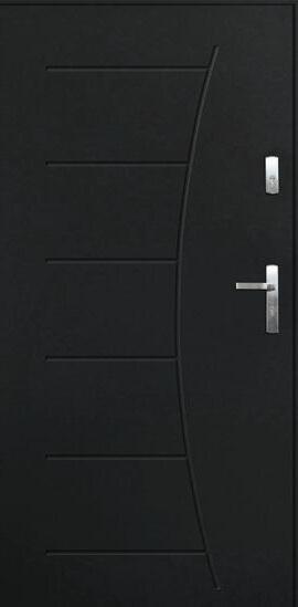 Drzwi zewnętrzne Verde wym. 80 i 90 cm, lewe/prawe skrzydło stalowe w kolorze antracyt o gr. 55 mm wypełnienie: spieniony polistyren ościeżnica w kolorze skrzydła wraz z progiem 2 zamki 3-punktowe + 2 wkładki z kluczami 3 bolce antywyważeniowe klamka wraz z szyldem górnym w komplecie