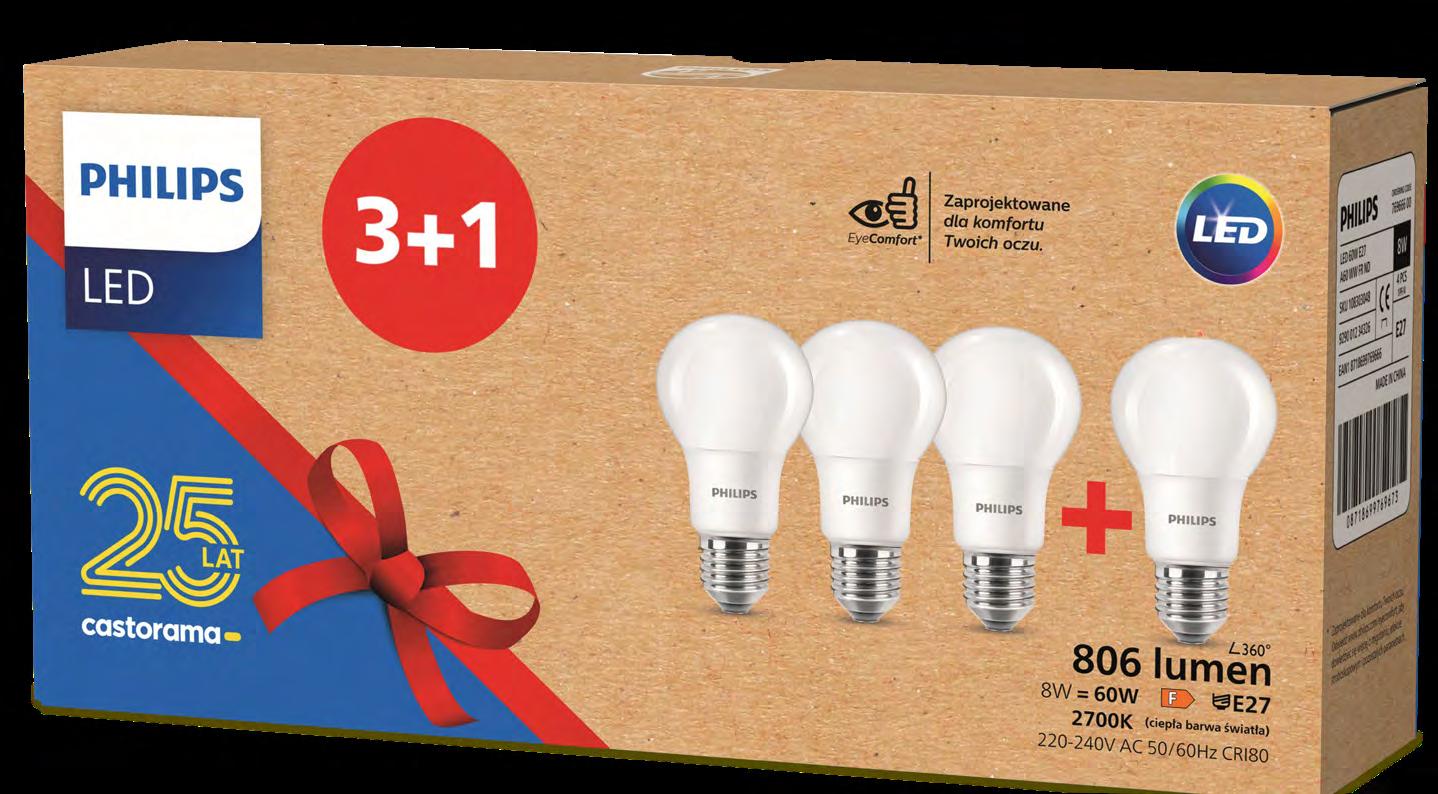 2 3 Żarówka LED 1 5059340455631 E14, 180 lm, 1800 K 2 5059340455624 E14, 180 lm, 1800 K 22,98 zł 3 5059340455600 E27, 250 lm, 1800 K 29,98 zł 4 5059340455570 E27, 400 lm, 1800 K 49,98 zł 5 5059340455563 E27, 100 lm, 1800 K 49,98 zł Wielopak żarówek LED A60, E27, 806 lm 8718699769673, barwa ciepła 2700 K 8718699770358, barwa neutralna 4000 K 8,75 zł/szt. Cena regularna pojedynczej żarówki 13,98 zł/szt. 1 Lampa wisząca Palmorla 9008606225798 1 x E27 2 Kinkiet Palmorla 9008606225811 1 x E27, 89,98 zł 3 Lampa wisząca Palmorla 9008606225804 3 x E27, 298 zł 1 Lampa Gabon 5059340487571, 1 x E27 dostępna także 5059340487588 3 x E27 368 zł 428 zł 2 Kinkiet Gabon 5059340487601 1 x E27 69,98 zł 89,98 zł 3 Lampa stołowa Gabon 5059340487595 1 x E27 99,98 zł 118 zł 34,98 zł *Przy zakupie 1 opak. wielopaku żarówek Philips 25 lat E27 lub E14 otrzymasz 50% rabatu na drugi wielopak Philips 25 lat E27 lub E14. Promocja obowiązuje w sklepach stacjonarnych i na castorama.pl od 2.11 do 20.11.2022 r. lub do wyczerpania zapasów. Szczegóły promocji w regulaminie w sklepach na castorama.pl 99,98 zł 128 268 zł 22,98 zł Lampa wisząca Libertad 9002759998554 3 x E27 348 zł 428 328 na drugi wielopak*-50% 3 3 3 4 5 2 2 2 1 1 1