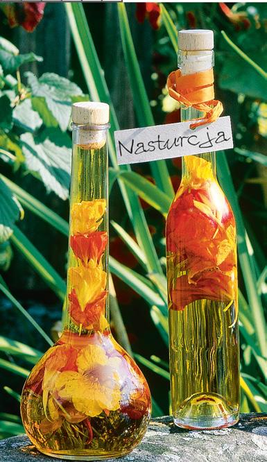 Składniki: pełna garść kolorowych kwiatów nasturcji, ozdobne, szczelnie zamykane szklane naczynie z szerokim otworem, wino białe lub ocet jabłkowy