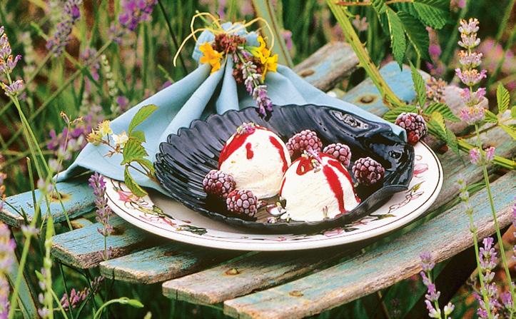 Kwiaty lawendy zalej winem i odstaw na 30 minut. Serek mascarpone wymieszaj z jogurtem na gładką masę. Odsącz wino, wymieszaj z syropem lawendowym i dodaj do masy z serka mascarpone. Białko ubij na sztywną pianę i delikatnie połącz z masą, następnie odstaw na kilka godzin do zamrażalnika. Przed podaniem udekoruj deser kwiatami i skrop odrobiną syropu.