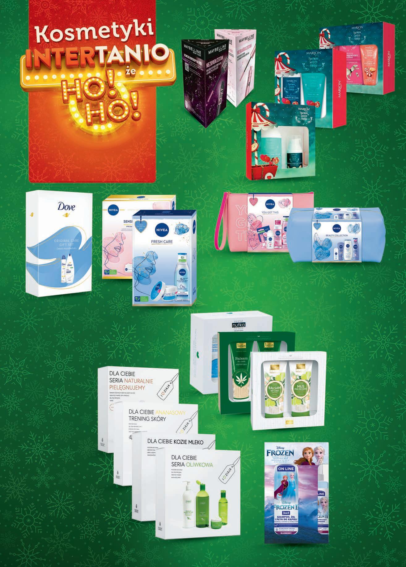 TANIO 2599 1 zestaw • Mus do twarzy, 200 ml + Krem do twarzy, 30 ml • Balsam do ciała, 100 ml + Krem do rąk, 50 ml • Krem do rąk , 50 ml + Zabieg do dłoni, 12 ml + Peeling do rąk , 50 ml MARION TANIO 1999 1 zestaw • Mus pod prysznic , 222 ml + Balsam do ciała, 222 ml • Żel pod prysznic , 222 ml + Balsam do ciała, 222 ml • Żel do twarzy, 150 ml + Płyn micelarny, 400 ml • Żel do twarzy, 100 ml + Płyn micelarny, 400 ml NUTKA TANIO 2999 1 zestaw Żel pod prysznic , 250 ml + Dezodrant spray, 150 ml DOVE TANIO 5999 1 zestaw Maskara, 9,5 ml + Błyszczyk do ust , 5,4 ml MAYBELLINE wybrane rodzaje TANIO 2999 1 zestaw • Mydło pod prysznic, 500 ml + Mleczko do ciała, 400 ml + Płyn micelarny, 200 ml + Krem do twarzy, 50 ml • Mydło pod prysznic , 500 ml + Mleczko do ciała, 400 ml + Krem do twarzy, 50 ml + Krem do rąk , 50 ml • Żel pod prysznic 2w1 , 160 ml + Mus do ciała, 160 ml + Mgiełka do ciała, 200 ml + Shot do twarzy szyi i dekoltu, 50 ml • Żel pod prysznic , 400 ml + Tonik do twarzy, 200 ml + Krem do