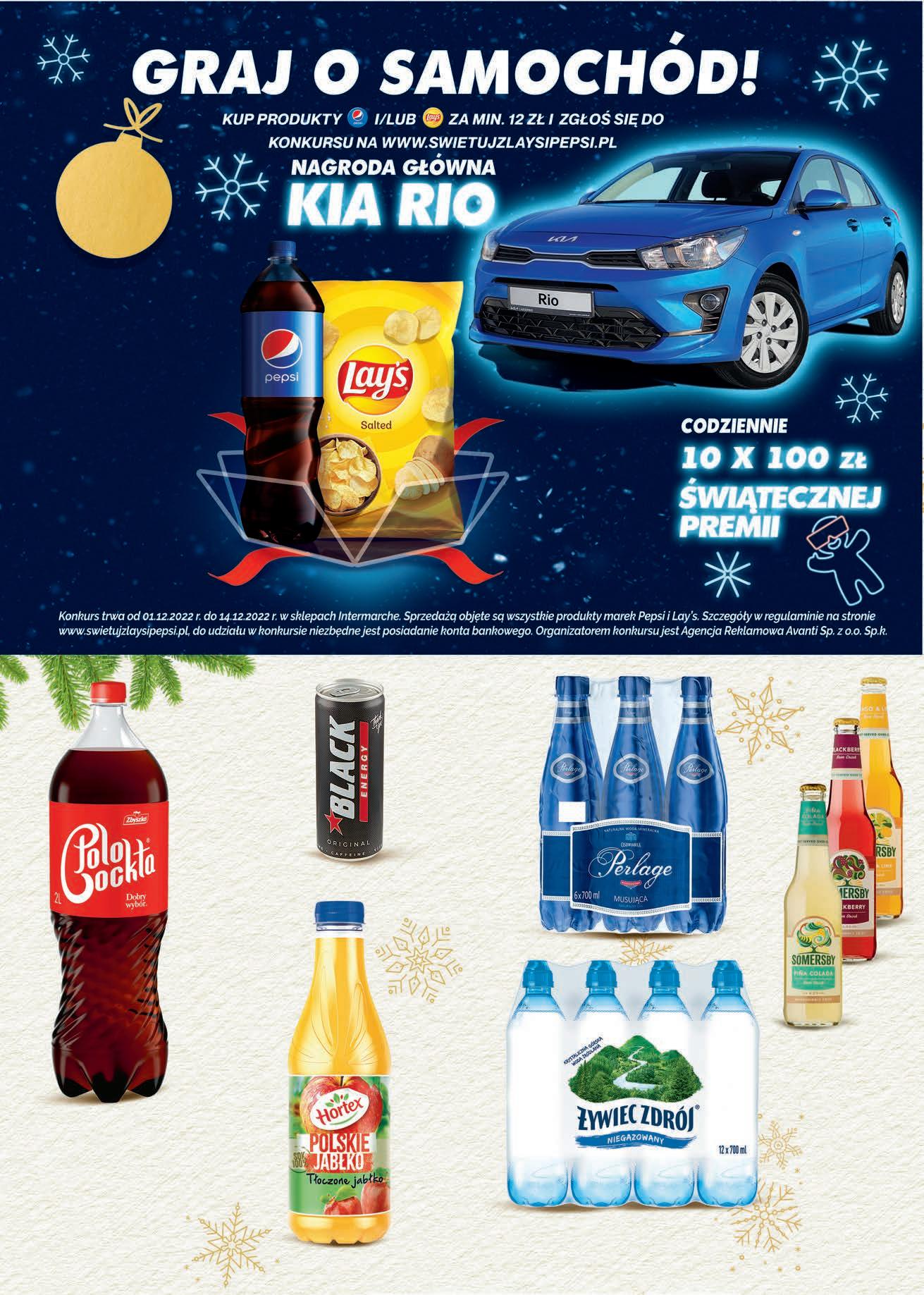 Napój piwny SOMERSBY wybrane rodzaje 0,4 l, 9,98 zł / 1 l -20% 399 1 szt. przy zakupie 3 szt. 4,99 możliwy MIX rodzajów Woda źródlana ŻYWIEC ZDROJ niegazowana 0,7 l, 2,70 zł / 1 l 1,99 Napój energetyzujący BLACK wybrane rodzaje 0,25 l, 9,96 zł / 1 l TANIO 249 1 szt. do 2,65 Sok 100% HORTEX tłoczone jabłko 1 l -27% 349 1 szt. 4,79 Chipsy LAY’S wybrane rodzaje 130 - 140 g od 3,85 do 4,15 zł / 100 g TANIO 539 1 opak. Pepsi Mirinda 7 Up 1,5 l wybrane rodzaje 3,66 zł / 1 l 6,69 możliwy MIX rodzajów 549 1 szt. przy zakupie 2 szt. -36% drugi produkt Polo Cockta 2 l, 2,00 zł / 1 l TANIO 399 1 szt. Woda mineralna CISOWIANKA PERLAGE musująca 0,7 l, 2,13 zł / 1 l 2,09 -28% 149 1 szt. przy zakupie 6 szt. PROMOCJA 1 - 19 GRUDNIA TANIO 189 1 szt. przy zakupie 12 szt.