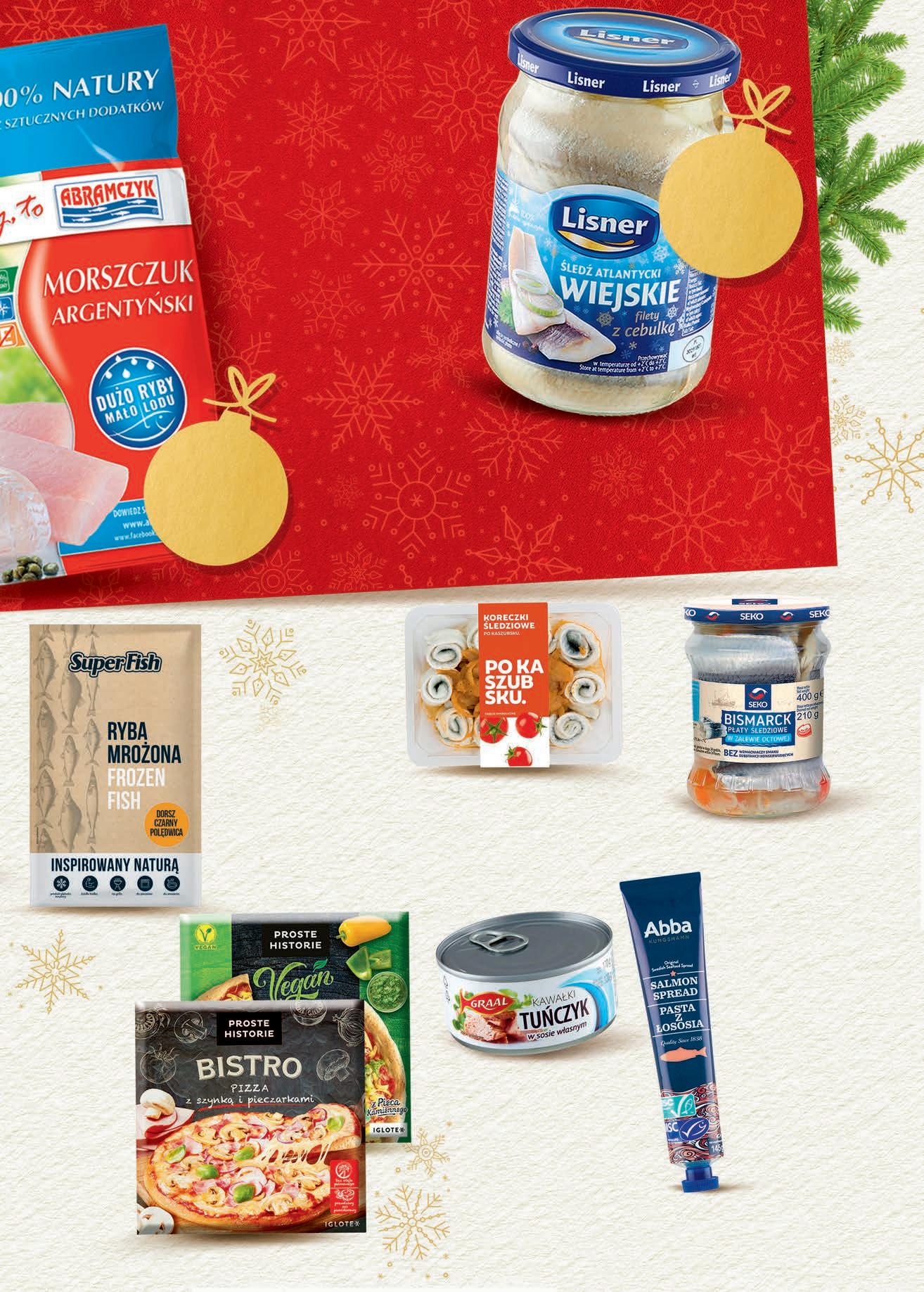 CZWARTEK – ŚRODA 1 - 7 grudnia Śledź Atlantycki LISNER Wiejskie filety z cebulką 600 g 26,65 zł / 1 kg 18,99 1599 1 opak. Pasta ABBA wybrane rodzaje 145 g, 68,90 zł / 1 kg 11,49 Płaty śledziowe Bismarck SEKO w zalewie octowej 400 g, 21,23 zł / 1 kg TANIO 849 1 szt. Tuńczyk GRAAL wybrane rodzaje 170 g / 120-170 g od 47,00 do 66,58 zł / 1 kg 9,19 TANIEJ 1,20 zł 799 1 szt. Dorsz czarny SUPERFISH Polędwica 330 g, 69,67 zł / 1 kg TANIO 2299 1 opak. • Morszczuk filety bez skóry • Miruna filety ze skórą ABRAMCZYK 450 g, 44,42 zł / 1 kg Pizza BISTRO wybrane rodzaje 340 - 435 g od 20,67 do 26,44 zł / 1 kg do 11,99 do 26,59 1999 1 opak. do 3 zł TANIEJ 899 1 szt. TANIEJ 3 zł • Koreczki śledziowe • Rarytas śledziowy • Śledź MIRKO wybrane rodzaje 200 g, 37,45 zł / 1 kg 8,19 TANIO 749 1 opak. do -25% TANIEJ 1,50 zł 999 1 szt. TANIEJ 6,60 zł do do -24%