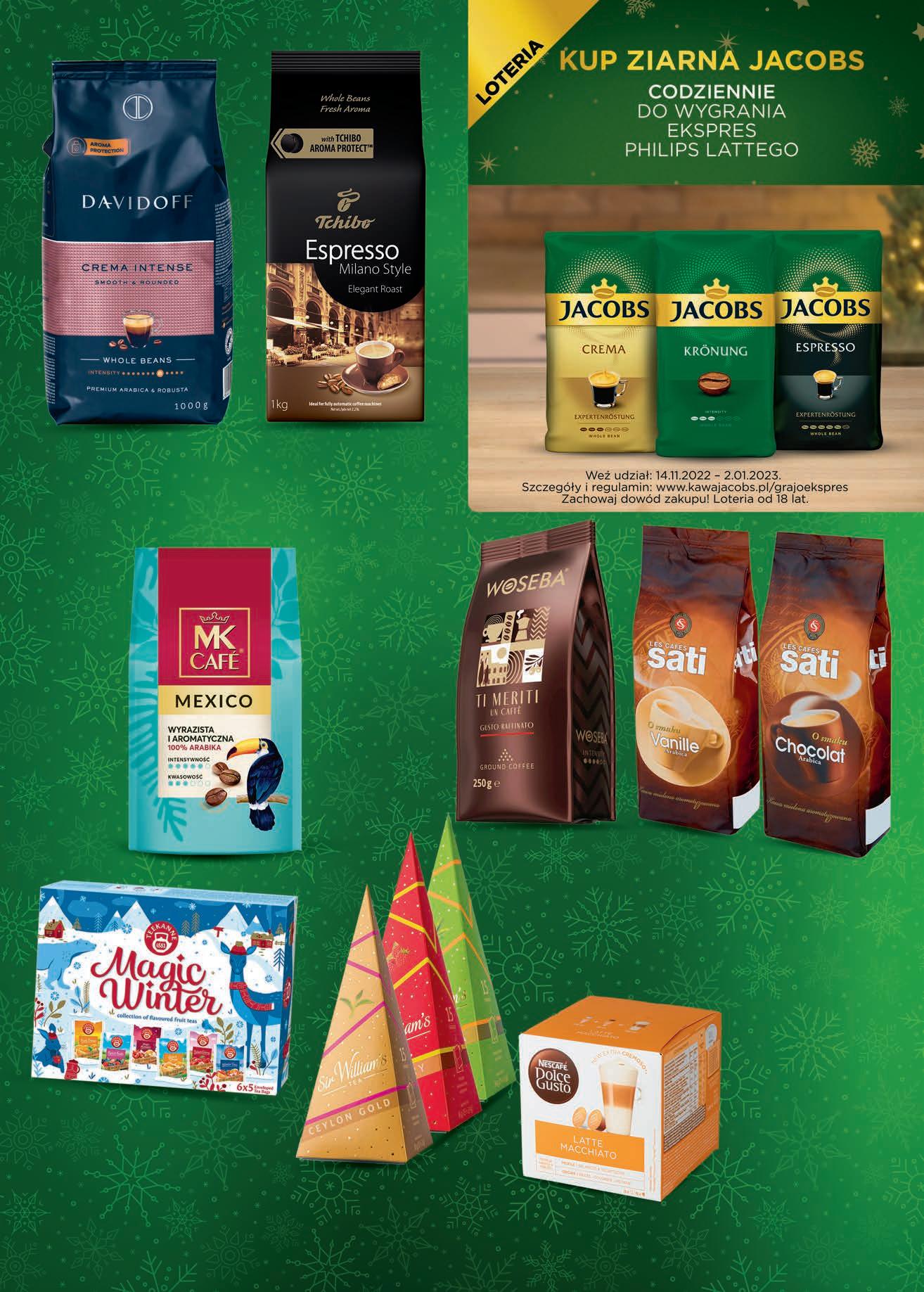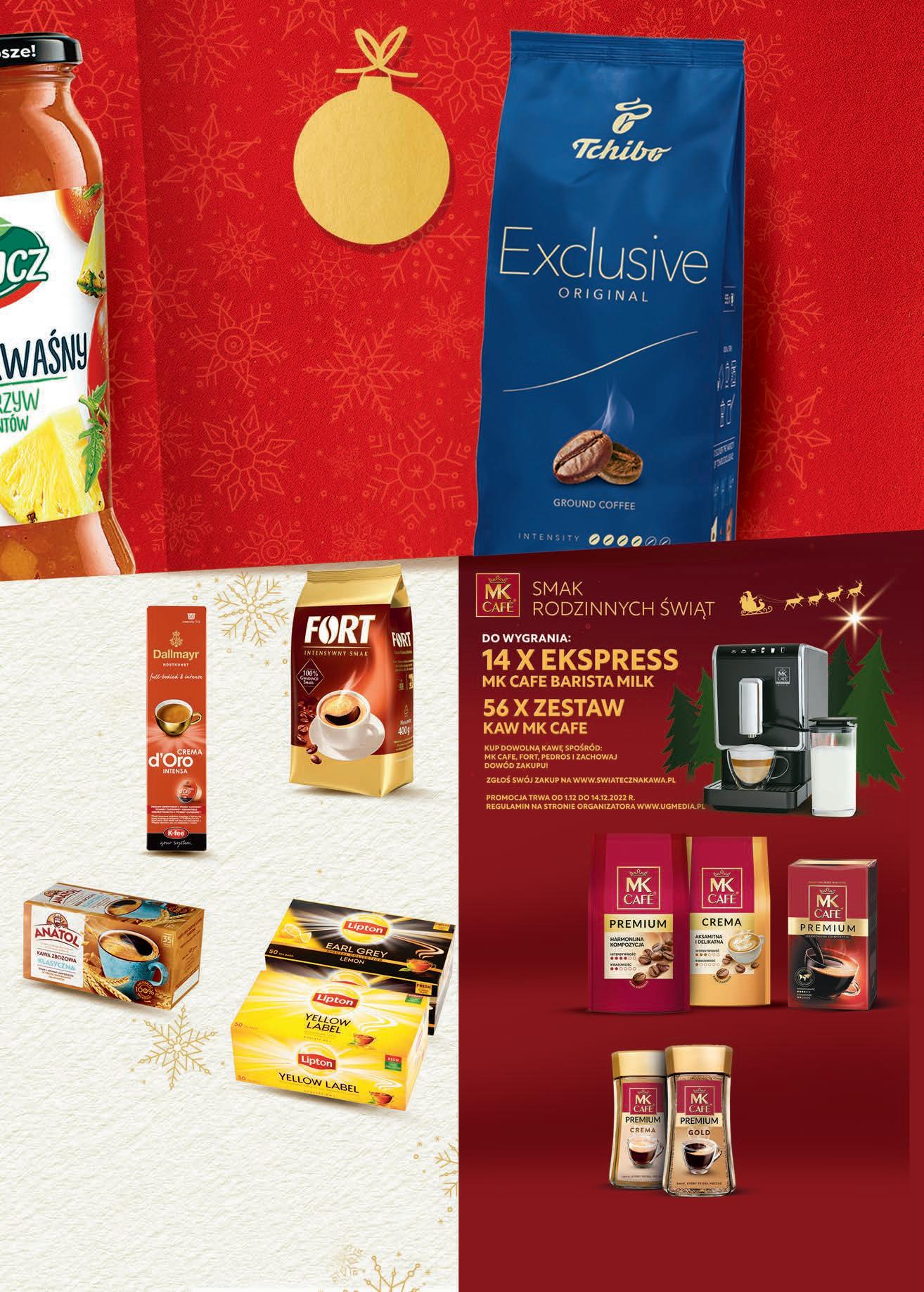 CZWARTEK – ŚRODA 1 - 7 grudnia -23% Kawa mielona TCHIBO wybrane rodzaje 500 g, 45,98 zł / 1 kg 29,99 2299 1 opak. Kawa ziarnista MK CAFE wybrane rodzaje 1 kg do 71,49 do 18,50 zł TANIEJ 5299 1 opak. Kawa mielona MK CAFE Premium 500 g, 47,98 zł / 1 kg 27,99 4 zł TANIEJ 2399 1 opak. Kawa rozpuszczalna MK CAFE wybrane rodzaje 130 - 175 g od 11,42 do 15,38 zł / 100 g 25,49 5,50 zł TANIEJ 1999 1 szt. Kawa zbożowa ANATOL wybrane rodzaje 147 g, 2,37 zł / 100 g TANIO 349 1 opak. 4,19 Kawa mielona FORT Intensywny Smak 400 g 36,23 zł / 1 kg 16,49 2 zł TANIEJ 1449 1 opak. Herbata LIPTON wybrane rodzaje 50 torebek x 1,5 - 2,3 g od 9,12 do 13,99 zł / 100 g do 11,49 do 1 zł TANIEJ 1049 1 opak. TANIEJ 7 zł PROMOCJA: 1 - 14 GRUDNIA -21% do -25% Kawa w kapsułkach DALLMAYR wybrane rodzaje 10 kapsułek 1,40 zł / 1 szt. 78 g, 17,94 zł / 100 g 17,99 4 zł TANIEJ 1399 1 opak. -22% 1 kg
