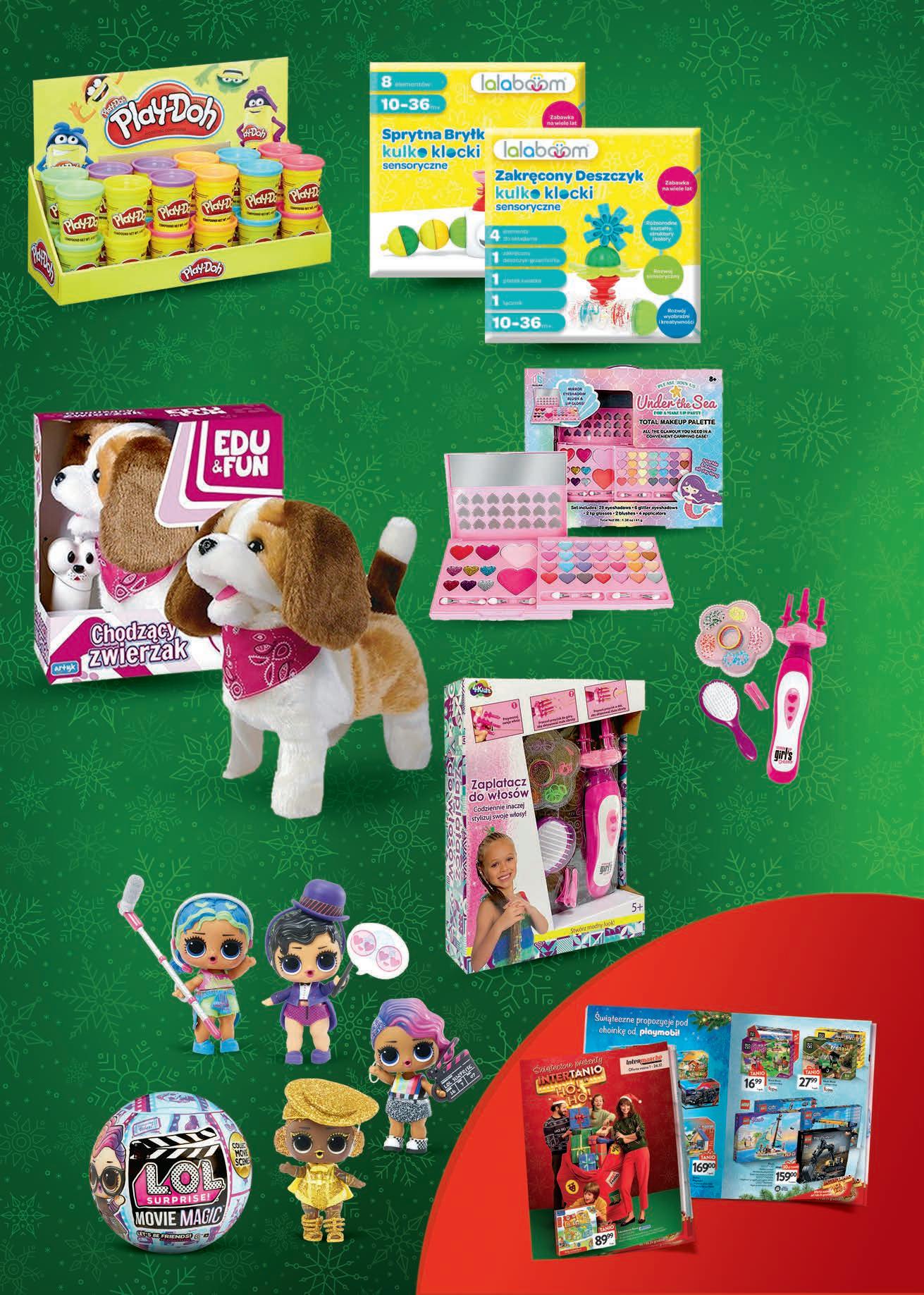 Więcej ŚWIĄTECZNYCH PREZENTÓW w nowym katalogu Zestaw do malowania dla dziewczynki wym. 42 x 33 x 5 cm TANIO 5999 1 zestaw Chodzący zwierzaczek mix wzorów sterowany pilotem przewodowo, idzie do przodu i tyłu, porusza pyszczkiem oraz szczeka TANIO 9999 1 szt. Play Doh masa plastyczna mix kolorów 2+1 GRATIS 599 1 szt. przy zakupie 3 szt. 8,99 możliwy MIX rodzajów Zestaw do zaplatania warkoczyków zestaw zawiera małe, kolorowe gumki oraz szczotkę do włosów PROMOCJA 1- 7.12 PROMOCJA 1- 7.12 Lalka L.O.L. seria Suprise Movie Magic mix wzorów 69,99 RABAT NALICZANY PRZY KASIE -50% drugi produkt 2999 1 szt. przy zakupie 2 szt. 39,99 Zabawka sensoryczna Lalaboom • Sprytna bryłka • Wkręcające foremki • Zakręcony deszczyk • Sprężyste tasiemki możliwy MIX rodzajów TANIO 5999 1 zestaw TANIEJ 20 zł 4999 1 szt.