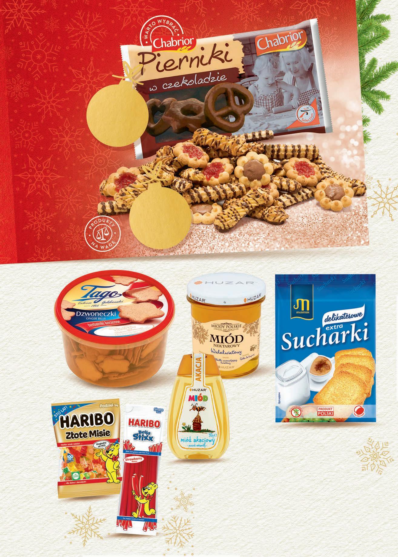 TANIEJ 1,30 zł 749 1 opak. Sucharki MAMUT wybrane rodzaje 225-230 g od 3,26 do 3,33 zł / 100 g 8,79 Pierniki CHABRIOR wybrane rodzaje 500 g, 1,20 zł / 100 g 7,09 Ciastka CHABRIOR wybrane rodzaje 1,69 TANIEJ 1,10 zł 729 1 opak. Herbatniki korzenne TAGO Dzwoneczki 300 g, 2,43 zł / 100 g 8,39 Miód HUZAR wybrane rodzaje 350 - 400 g od 39,98 do 45,69 zł / 1 kg do 18,49 TANIEJ do 2,50 zł 1599 1 szt. CZWARTEK – ŚRODA 1 - 7 grudnia • Żelki • Pianki HARIBO wybrane rodzaje 160 - 175 g od 2,85 do 3,12 zł / 100 g do 6,19 TANIEJ do 1,20 zł 499 1 opak. 599 1 opak. 149 100 g TANIO TANIEJ 1,10 zł