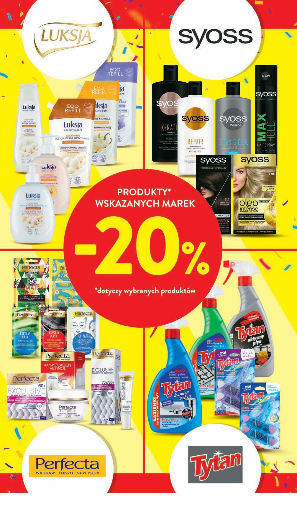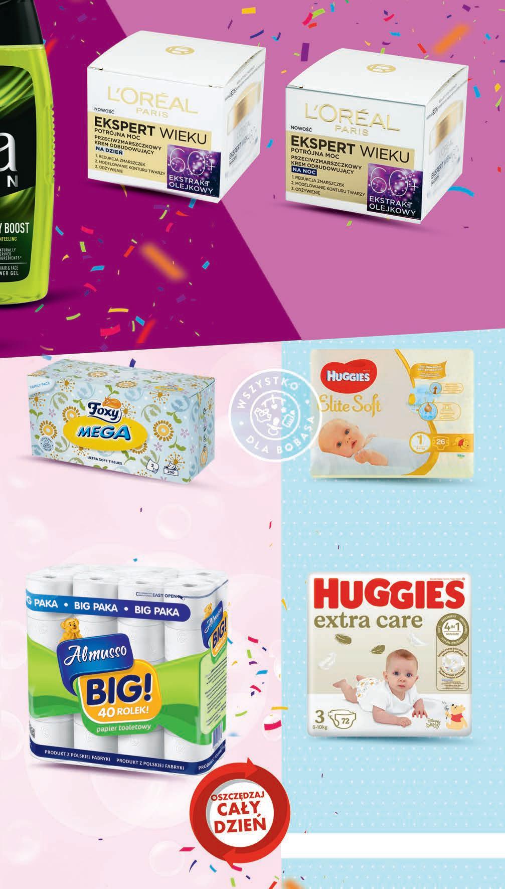 Pieluszki dla dzieci HUGGIES EXTRA CARE wybrane rodzaje 28 - 40 szt. od 1,12 do 1,61 zł / 1 szt. *Najniższa cena z 30 dni przed obniżką 4499 1 opak. 51,99 * -13% CZWARTEK – ŚRODA 5 - 11 października Pieluszki HUGGIES ELITE SOFT wybrane rodzaje 24 - 26 szt. od 0,58 do 0,62 zł / 1 szt. *Najniższa cena z 30 dni przed obniżką 1499 1 opak. 18,99 * -21% Papier toaletowy ALMUSSO Big! 40 rolek , 0,75 zł / 1 rolka TANIO 2999 1 opak. Chusteczki higieniczne FOXY wybrane rodzaje 90 - 200 szt., od 0,04 do 0,08 zł / 1 szt. cream - 7,79 zł*, cotton, mega - 8,49 zł* *Najniższa cena z 30 dni przed obniżką 749 1 opak. PROMO! 0,75 zł 1 rolka Krem do twarzy L’OREAL EKSPERT WIEKU 40+ na dzień 50+ na noc 60+ na noc 70+ na dzień 50 ml, 39,98 zł / 100 ml *Najniższa cena z 30 dni przed obniżką 1999 1 szt. 37,49 * -46% Krem do twarzy L’OREAL EKSPERT WIEKU 50+ na dzień 60+ na dzień 70+ na noc 50 ml, 39,98 zł / 100 ml *Najniższa cena z 30 dni przed obniżką 1999 1 szt. 35,99 * -44%