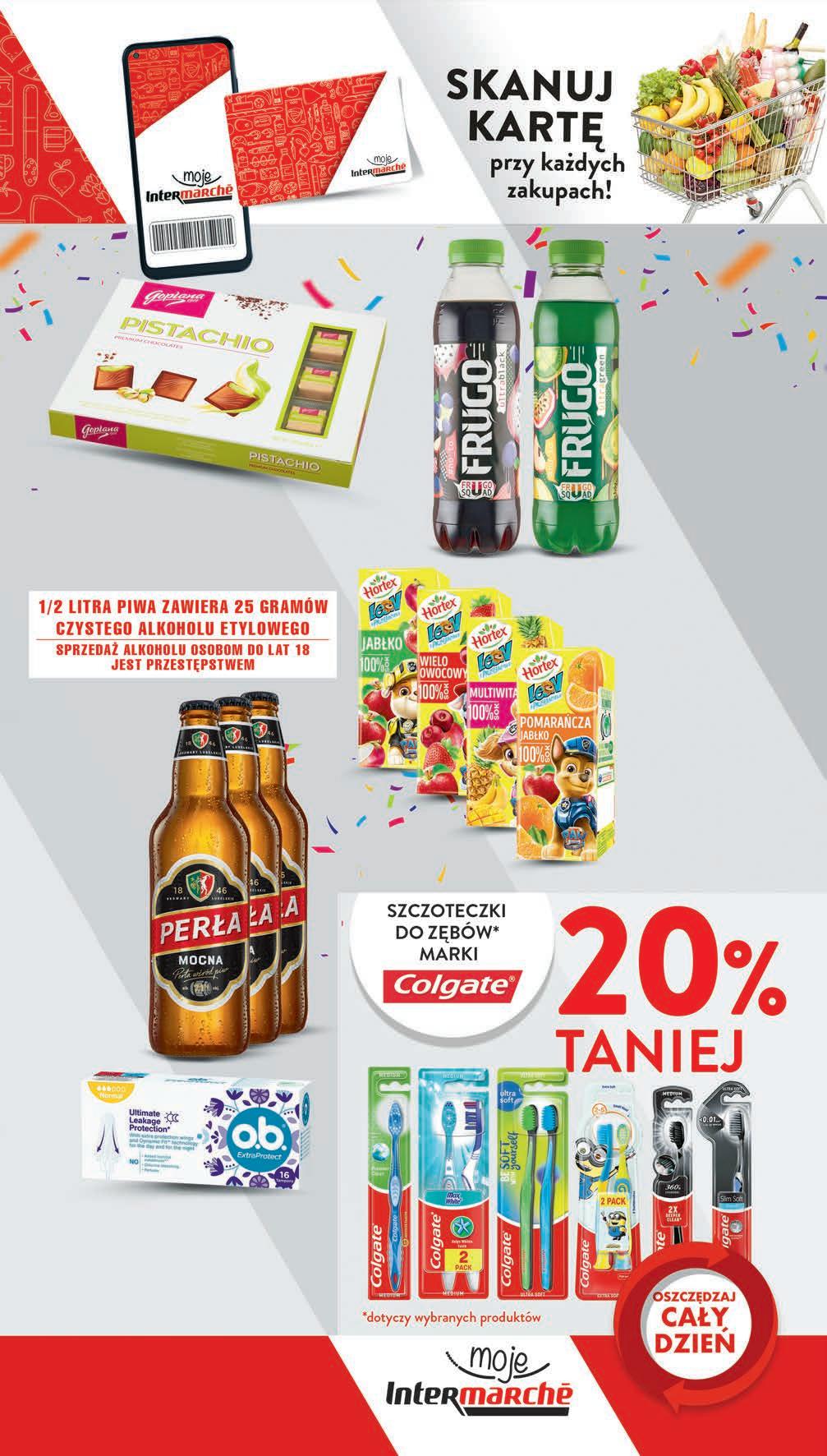 299 1 szt. -16% przy zakupie 3 szt. 3,59 * Piwo PERŁA Mocna 0,5 l, 5,98 zł / 1 l *Najniższa cena z 30 dni przed obniżką i cena bez karty możliwy MIX rodzajów Sok 100% HORTEX wybrane rodzaje 0,2 l, 8,45 zł / 1 l *Najniższa cena z 30 dni przed obniżką i cena bez karty 169 1 szt. przy zakupie 4 szt. 1,99 * -15% CZWARTEK – ŚRODA 5 - 11 października RABAT NALICZANY PRZY KASIE Tampony O.B. EXTRA PROTECT wybrane rodzaje 16 szt., 0,78 zł / 1 szt. *Najniższa cena z 30 dni przed obniżką. Cena regularna i cena bez karty 15,49 zł 1249 1 opak. 13,99 * -10% Czekoladki GOPLANA Pistachio 200 g, 7,35 zł / 100 g *Najniższa cena z 30 dni przed obniżką i cena bez karty 1469 1 opak. 20,99 * -30% 199 1 szt. drugi produkt -46% przy zakupie 2 szt. 2,59 * Napój niegazowany FRUGO wybrane rodzaje 0,5 l, 3,98 zł / 1 l *Najniższa cena z 30 dni przed obniżką. Cena regularna i cena bez karty 2,79 zł możliwy MIX rodzajów