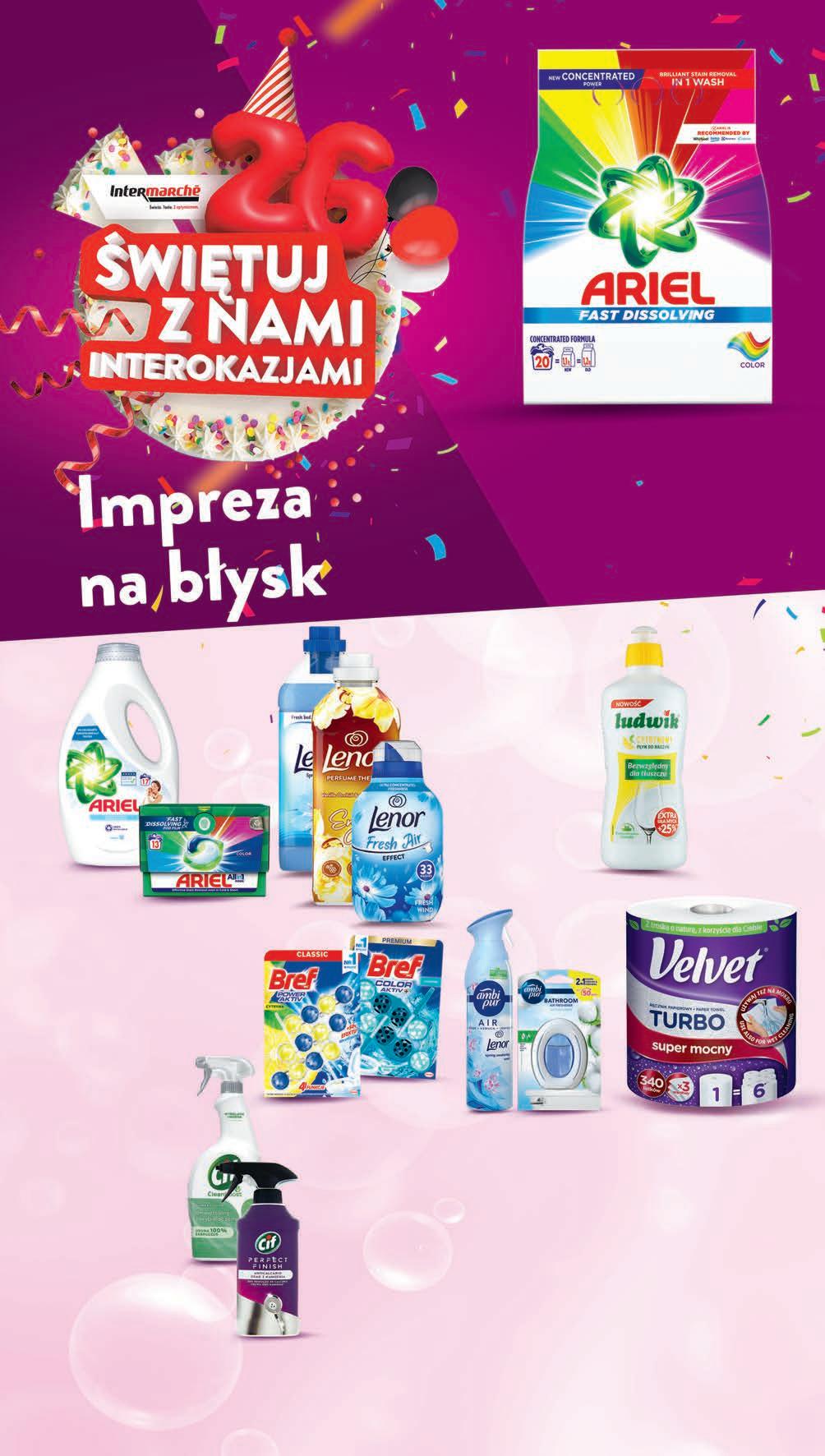 CZWARTEK – ŚRODA 5 - 11 października Płyn do naczyń LUDWIK wybrane rodzaje 0,45 kg 8,87 zł / 1 kg TANIO 399 1 szt. Proszek do prania ARIEL wybrane rodzaje 1,1 kg , 22,72 zł / 1 kg 20 prań, 1,25 zł / 1 pranie *Najniższa cena z 30 dni przed obniżką 2499 1 opak. 33,99 * -26% TANIO 2799 1 opak. • Płyn do prania 0,85 l, 32,93 zł / 1 l 17 prań 1,65 zł / 1 pranie • Kapsułki do prania 10 - 13 szt. od 2,15 do 2,80 zł / 1 szt. ARIEL wybrane rodzaje Płyn do płukania LENOR wybrane rodzaje 0,462 - 1,23 l od 15,44 do 41,10 zł / 1 l *Najniższa cena z 30 dni przed obniżką 1899 1 szt. 23,69 * -19% Odświeżacz powietrza AMBI PUR spray, 300 ml żel, 7,5 ml wybrane rodzaje od 5,00 do 199,87 zł / 100 ml spray - 17,99 zł*, żel - 20,39 zł* *Najniższa cena z 30 dni przed obniżką 1499 1 szt. PROMO! Spray do czyszczenia CIF wybrane rodzaje 0,435 - 0,75 l od 25,32 do 43,66 zł / 1 l *Najniższa cena z 30 dni przed obniżką 1899 1 szt. 20,99 * PROMO! Ręcznik papierowy VELVET Turbo 1 rolka *Najniższa cena z 30 dni przed obniżką 1499 1 szt. 22,99 * -34% PROMOCJA 5-18.10 Kulki do WC BREF wybrane rodzaje 3 x 50 g 2 x 50 g od 9,33 do 13,99 zł / 100 g color aktiv - 17,49 zł* power aktiv - 18,55 zł* *Najniższa cena z 30 dni przed obniżką 13993-pack/ /2 pack PROMO! PROMOCJA 5-18.10