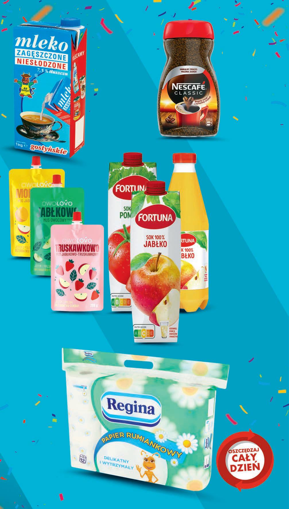 Kawa rozpuszczalna NESCAFE Classic 200 g, 11,00 zł / 100 g *Najniższa cena z 30 dni przed obniżką 2199 1 szt. 27,99 * -21% Mleko zagęszczone GOSTYŃ niesłodzone 1 kg *Najniższa cena z 30 dni przed obniżką 799 1 szt. 10,99 * -27% Papier toaletowy REGINA rumiankowy 12 rolek, 1,67 zł / 1 rolka *Najniższa cena z 30 dni przed obniżką 1999 1 opak. 23,69 * -15% Sok 100% FORTUNA wybrane rodzaje 1 l jabłko karton, jabłko butelka - 4,79 zł*, pomidor karton, pomidorowo -warzywny karton - 4,99 zł* *Najniższa cena z 30 dni przed obniżką 349 1 szt. przy zakupie 3 szt. PROMO! możliwy MIX rodzajów RABAT NALICZANY PRZY KASIE LIMIT 2 opak. 2 Mus OWOLOVO wybrane rodzaje 200 g, 1,30 zł / 100 g *Najniższa cena z 30 dni przed obniżką 259 1 szt. 3,49 * -25% 1 kg