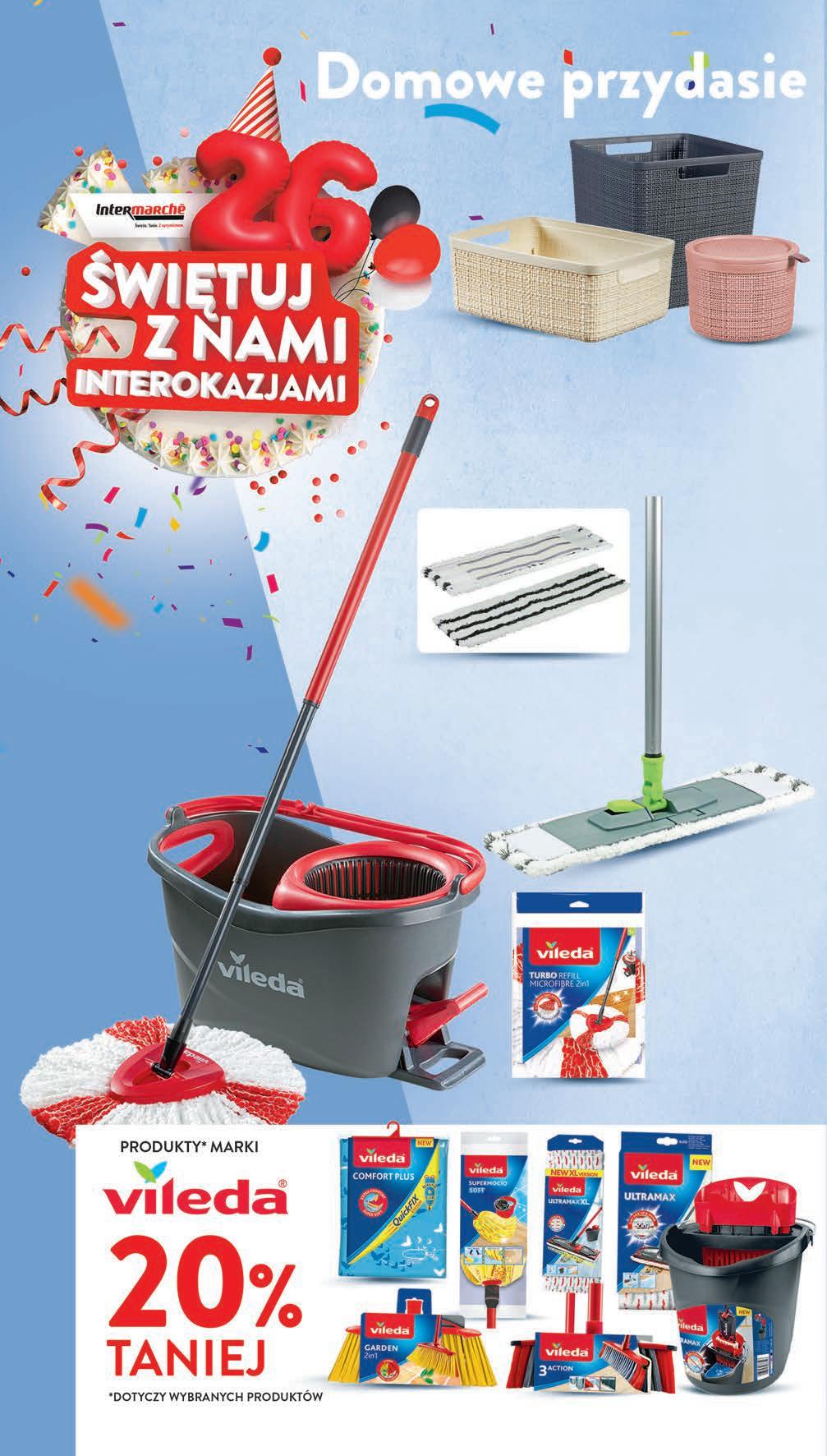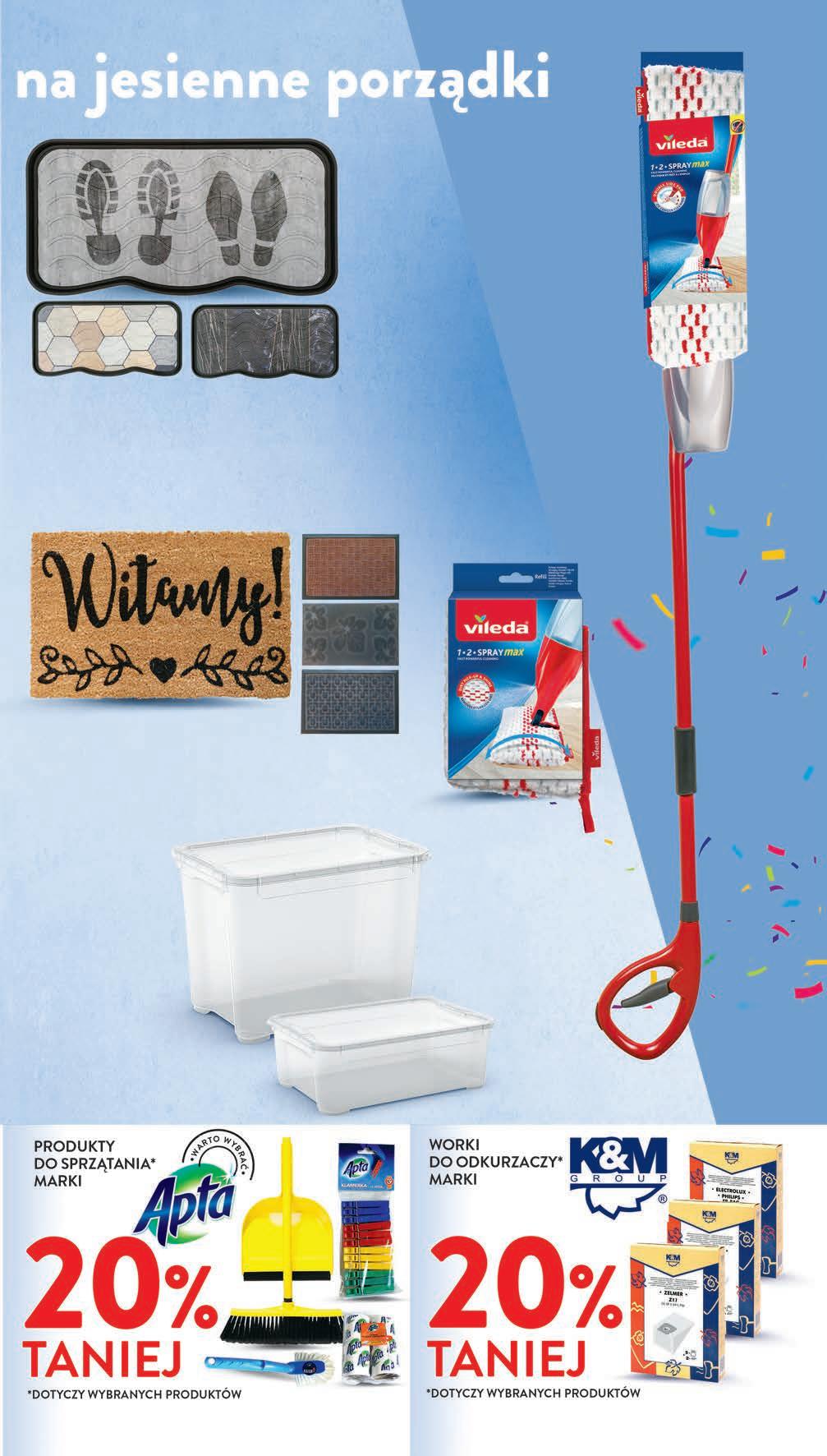 Wkład do mopa Vileda Spray TANIO 2999 1 szt. Mop ze spryskiwaczem 1-2 Spray Max HIT 8999 1 szt. Ociekacz na buty gumowy - 14,99 zł plastikowy z nadrukiem - 29,99 zł różne rodzaje TANIO od 1499 1 szt. Wycieraczka 40 x 60 cm - 19,99 zł 55 x 35 cm - 29,99 zł różne rodzaje TANIO od 1999 1 szt. • obrotowa głowica • dwustronna nakładka z mikrofibry • równomierne rozprowadzanie płynu dzięki mechanizmowi sprayu • zbiornik na płyn o poj. 600 ml CZWARTEK – ŚRODA 5 - 11 października Plastikowy pojemnik z pokrywką przezroczysty: poj. 14 l - 19,99 zł poj. 20 l - 24,99 zł poj. 32 l - 39,99 zł TANIO od 1999 1 szt.