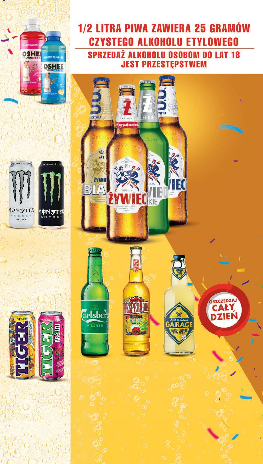 329 1 szt. PROMO! przy zakupie 2 szt. Napój energetyzujący TIGER wybrane rodzaje 0,5 l, 6,58 zł / 1 l ufo - 3,89 zł* arbuzi, mango bomb - 3,99 zł* *Najniższa cena z 30 dni przed obniżką możliwy MIX rodzajów 499 1 szt. drugi produkt -33% przy zakupie 2 szt. 5,99 * Napój energetyzujący MONSTER wybrane rodzaje 0,5 l, 9,98 zł / 1 l *Najniższa cena z 30 dni przed obniżką możliwy MIX rodzajów Piwo CARLSBERG Premium Pilsner 0,5 l, 7,78 zł / 1 l *Najniższa cena z 30 dni przed obniżką 389 1 szt. przy zakupie 3 szt. 4,55 * -14% Piwo DESPERADOS wybrane rodzaje 0,4 l, 10,98 zł / 1 l *Najniższa cena z 30 dni przed obniżką 439 1 szt. 5,65 * -22% Napój piwny GARAGE wybrane rodzaje 0,4 l, 11,23 zł / 1 l *Najniższa cena z 30 dni przed obniżką 449 1 szt. 5,49 * -18% Napój niegazowany OSHEE wybrane rodzaje 0,555 l, 4,31 zł / 1 l magnesium + b6, vitamins & minerals - 3,19 zł*, vitamin C 500 - 3,59 zł* *Najniższa cena z 30 dni przed obniżką możliwy MIX rodzajów 239 1 szt. PROMO! przy zakupie 2 szt. Piwo ŻYWIEC wybrane rodzaje 0,5 l , 5,50 zł / 1 l butelka zwrotna *Najniższa cena z 30 dni przed obniżką Cena regularna: jasne premium, jasne 0,0% - 3,69 zł, jasne lekkie 3,79 zł, białe 0,0% - 4,19 zł możliwy MIX rodzajów 275 1 szt. przy zakupie 4 szt. 2,89 * PROMO! CZWARTEK – ŚRODA 5 - 11 października