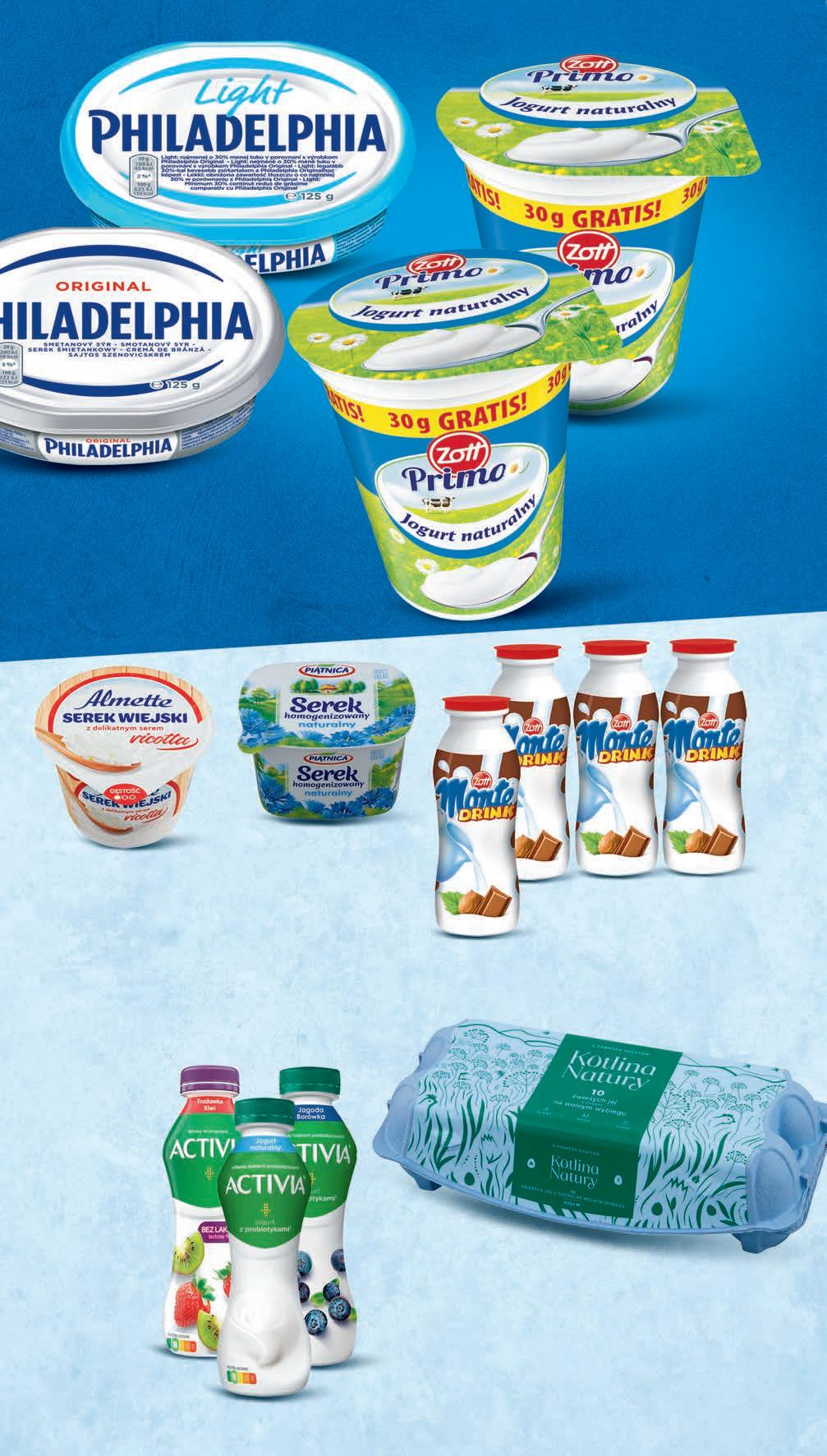 Jaja z chowu na wolnym wybiegu KOTLINA NATURY M 10 szt., 1,00 zł / 1 szt. *Cena sprzed pierwszego zastosowania obniżki 999 1 opak. 11,99 * -16% Jogurt ZOTT PRIMO naturalny 370 g , 0,67 zł / 100 g *Cena sprzed pierwszego zastosowania obniżki 249 1 szt. drugi produkt -51% przy zakupie 2 szt. 3,35 * Serek wiejski ALMETTE wybrane rodzaje 150 g , 1,93 zł / 100 g *Cena sprzed pierwszego zastosowania obniżki 289 1 szt. 3,69 * -21% Serek homogenizowany PIĄTNICA wybrane rodzaje 150 g , 1,53 zł / 100 g *Cena sprzed pierwszego zastosowania obniżki 229 1 szt. 2,95 * -22% CZWARTEK – ŚRODA 14 - 20 września Serek PHILADELPHIA wybrane rodzaje 125 g przy zakupie 1 szt. 6,99 zł, 5,59 zł / 100 g możliwy MIX rodzajów 1+1 GRATIS Monte Drink ZOTT 200 ml, 1,31 zł / 100 ml *Cena sprzed pierwszego zastosowania obniżki 262 1 szt. przy zakupie 4 szt. 3,49 * 3+1 GRATIS Activia DANONE wybrane rodzaje 270 - 280 g od 1,25 do 1,29 zł / 100 g activia - 4,49 zł* activia bez laktozy - 4,69 zł* *Cena sprzed pierwszego zastosowania obniżki 349 1 szt. przy zakupie 3 szt. PROMO! możliwy MIX rodzajów