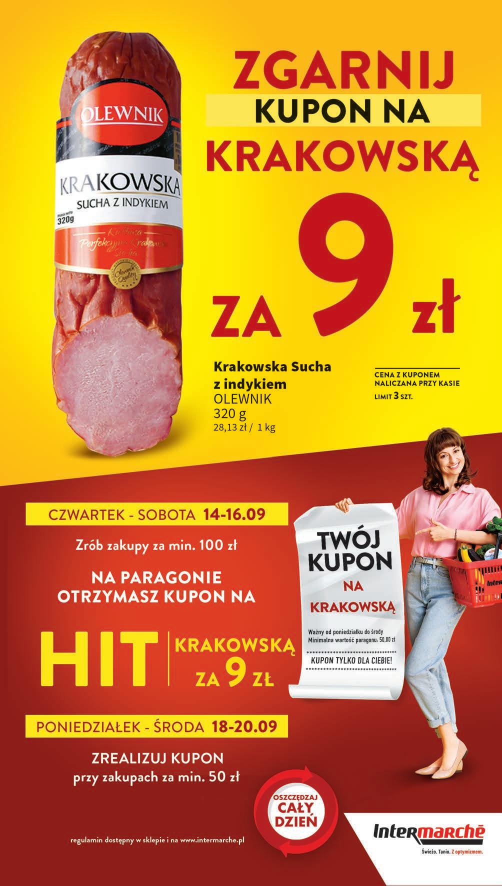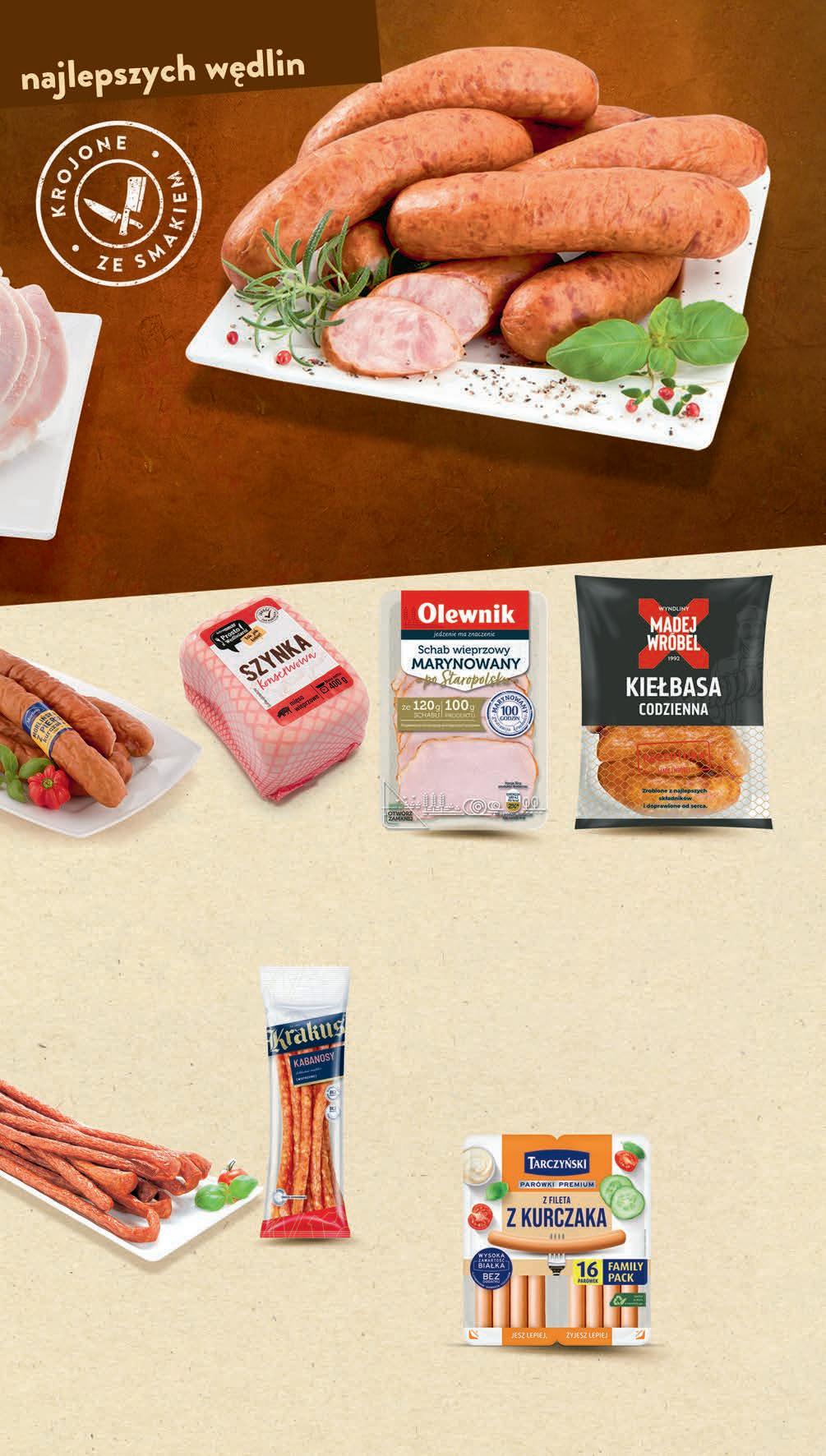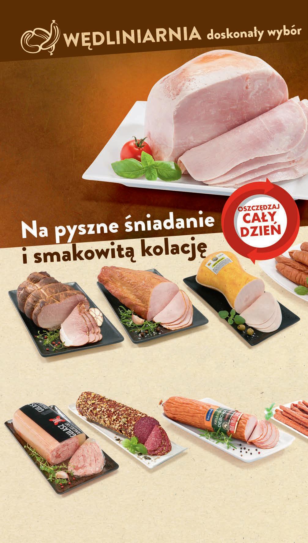1999 1 kg 22,99 * -13% Kiełbasa śląska PROSTO Z WĘDLINIARNI *Cena sprzed pierwszego zastosowania obniżki Kabanosy KRAKUS wybrane rodzaje 95 g, 57,79 zł / 1 kg TANIO 549 1 opak. 3799 1 kg 44,99 * -15% Kabanosy Klasyczne TARCZYŃSKI wybrane rodzaje *Cena sprzed pierwszego zastosowania obniżki • Kiełbasa codzienna • Kiełbasa na ruszt MADEJ WRÓBEL 600 g, 21,65 zł / 1 kg *Cena sprzed pierwszego zastosowania obniżki 1299 1 opak. 14,99 * -13% • Schab wieprzowy marynowany po staropolski • Szynka wieprzowa marynowana po staropolsku OLEWNIK 90 g, 66,56 zł / 1 kg *Cena sprzed pierwszego zastosowania obniżki Parówki Premium TARCZYŃSKI z fileta z kurczaka 360 g, 37,47 zł / 1 kg TANIO 1349 1 opak. CZWARTEK – ŚRODA 14 - 20 września 2999 1 kg 33,99 * -11% Kiełbasa Morlińska z piersią kurczaka MORLINY *Cena sprzed pierwszego zastosowania obniżki Szynka konserwowa PROSTO Z WĘDLINIARNI 200 g, 29,95 zł / 1 kg *Cena sprzed pierwszego zastosowania obniżki 599 1 szt. 6,47 * PROMO! 599 1 opak. 6,19 * PROMO!