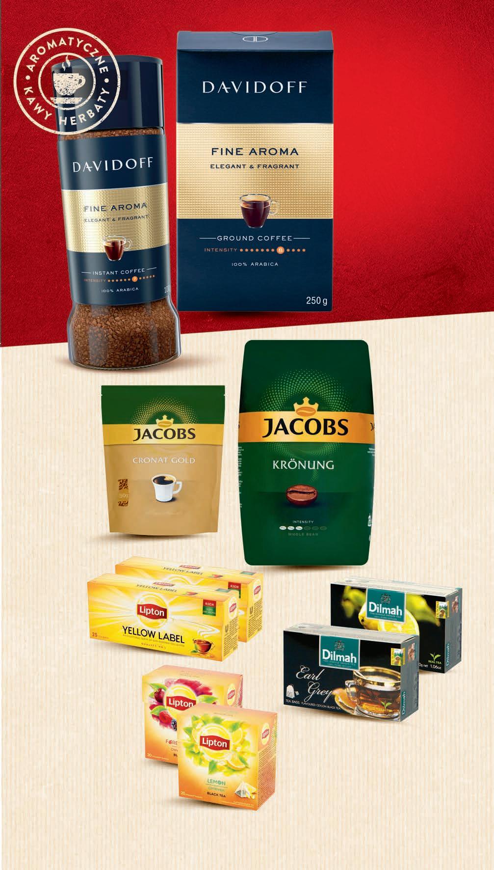 1 kg • Kawa mielona 250 g , 99,96 zł / 1 kg • Kawa rozpuszczalna 90 - 100 g od 24,99 do 27,77 zł / 100 g DAVIDOFF wybrane rodzaje *Najniższa cena z 30 dni przed obniżką 2499 1 opak. 39,99 * -37% Kawa rozpuszczalna JACOBS Cronat Gold 150 g , 13,33 zł / 100 g *Najniższa cena z 30 dni przed obniżką cena regularna 23,99 zł 1999 1 opak. 21,99 * PROMO! Kawa ziarnista JACOBS wybrane rodzaje 1 kg *Najniższa cena z 30 dni przed obniżką 5499 1 opak. 67,99 * -19% Herbata DILMAH wybrane rodzaje 20 torebek x 1,5 g 26,63 zł / 100 g *Najniższa cena z 30 dni przed obniżką CZWARTEK – ŚRODA 14 - 20 września Herbata LIPTON Yellow Label 25 torebek x 2 g 13,50 zł / 100 g *Najniższa cena z 30 dni przed obniżką 675 1 opak. drugi produkt -50% przy zakupie 2 opak. 8,99 * Herbata LIPTON wybrane rodzaje 20 torebek x 1,7-1,8 g od 19,69 do 20,85 zł / 100 g *Najniższa cena z 30 dni przed obniżką 709 1 opak. drugi produkt -50% przy zakupie 2 opak. 9,49 * możliwy MIX rodzajów 799 1 opak. 9,49 * -15%