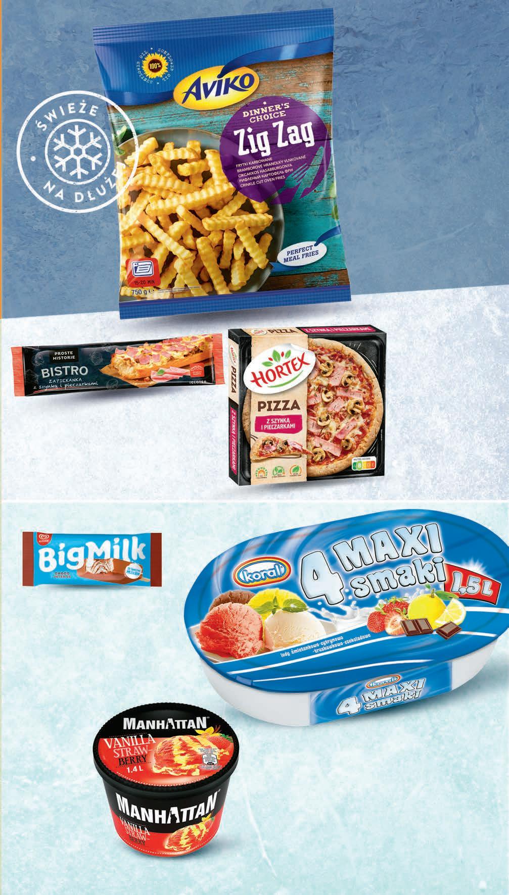Lody KORAL wybrane rodzaje 1,5 l, 9,99 zł / 1 l *Cena sprzed pierwszego zastosowania obniżki 1499 1 szt. 20,99 * -28% Lody MANHATTAN wybrane rodzaje 1,4 l, 11,42 zł / 1 l *Cena sprzed pierwszego zastosowania obniżki 1599 1 szt. 22,85 * -30% CZWARTEK – ŚRODA 14 - 20 września RABAT NALICZANY PRZY KASIE 745 1 opak. 8,49 * -12% Frytki AVIKO wybrane rodzaje 750 g, 9,93 zł / 1 kg *Cena sprzed pierwszego zastosowania obniżki Lody BIG MILK INTENSE wybrane rodzaje 100 ml, 31,90 zł / 1 l *Cena sprzed pierwszego zastosowania obniżki 319 1 szt. 3,99 * -20% Zapiekanka Bistro PROSTE HISTORIE wybrane rodzaje 200 g , 2,15 zł / 100 g z pieczarkami, z szynką i pieczarkami - 5,19 zł*, z kurczakiem - 5,99 zł* *Cena sprzed pierwszego zastosowania obniżki 429 1 szt. PROMO! Pizza HORTEX wybrane rodzaje 285 - 345 g od 28,96 do 35,05 zł / 1 kg *Cena sprzed pierwszego zastosowania obniżki 999 1 szt. 12,35 * -19%