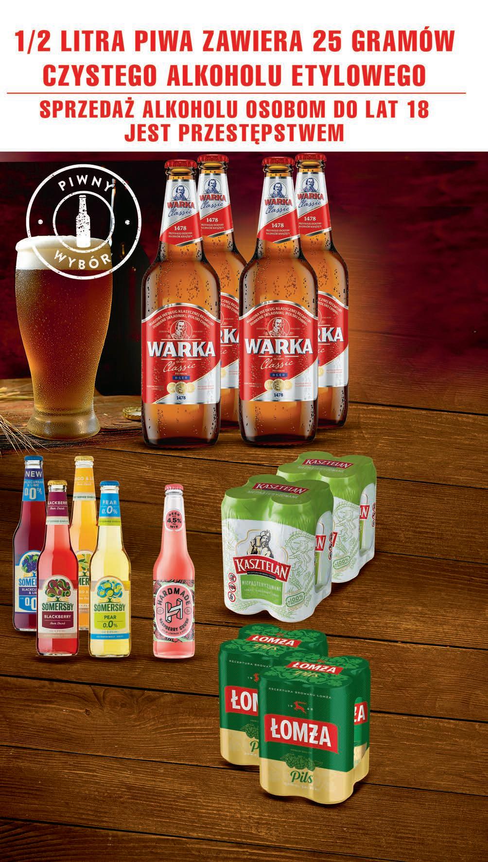 Piwo WARKA Classic 0,5 l, 4,98 zł / 1 l butelka zwrotna *Najniższa cena z 30 dni przed obniżką 3,49 zł za puszkę 13964-pack drugi 4-pack -25% przy zakupie 2x4-pack 15,96 * Piwo KASZTELAN niepasteryzowane 4 x 0,5 l, 6,98 zł / 1 l *Najniższa cena z 30 dni przed obniżką 11964-pack drugi 4-pack -33% przy zakupie 2x4-pack 14,39 * Piwo ŁOMŻA Pils 4 x 0,5 l, 5,98 zł / 1 l *Najniższa cena z 30 dni przed obniżką CZWARTEK – ŚRODA 14 - 20 września 369 1 szt. przy zakupie 4 szt. 5,49 * -32% Napój piwny SOMERSBY wybrane rodzaje 0,4 l, 9,23 zł / 1 l *Najniższa cena z 30 dni przed obniżką możliwy MIX rodzajów 449 1 szt. 5,19 * -13% Napój piwny HARDMADE wybrane rodzaje 0,4 l, 11,23 zł / 1 l *Najniższa cena z 30 dni przed obniżką 2,99 zł za puszkę 249 1 szt. przy zakupie 4 szt. -28% 3,49 *