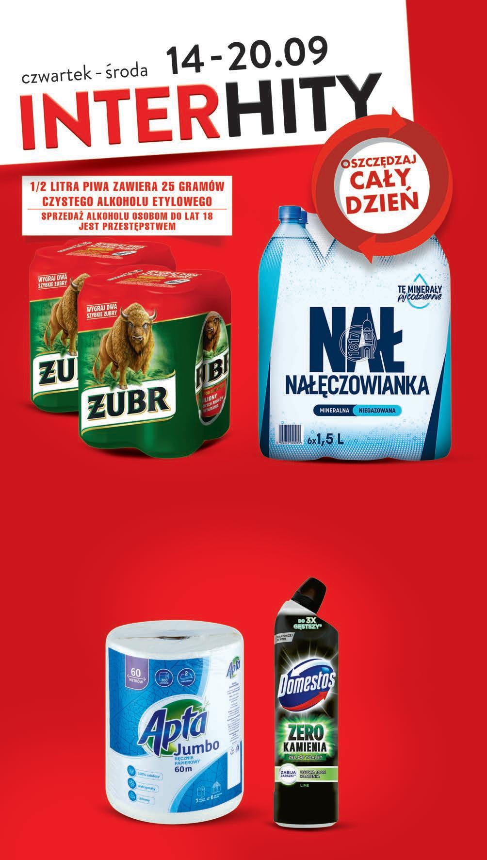 149 1 szt. -37% przy zakupie 6 szt. 2,39 * Woda mineralna NAŁĘCZOWIANKA wybrane rodzaje 1,5 l, 0,99 zł / 1 l *Najniższa cena z 30 dni przed obniżką możliwy MIX rodzajów 11164-pack drugi 4-pack -56% przy zakupie 2x4-pack 15,56 * 2,79 zł za puszkę Piwo ŻUBR jasne pełne 4 x 0,5 l 5,58 zł / 1 l *Najniższa cena z 30 dni przed obniżką 999 1 szt. HIT Żel do WC DOMESTOS ZERO KAMIENIA wybrane rodzaje 0,75 l, 18,65 zł / 1 l *Najniższa cena z 30 dni przed obniżką cena regularna 17,99 zł PROMOCJA 14-27.09 1399 1 szt. 14,99 * PROMO! Ręcznik papierowy APTA Jumbo 1 rolka PROMOCJA 14-27.09