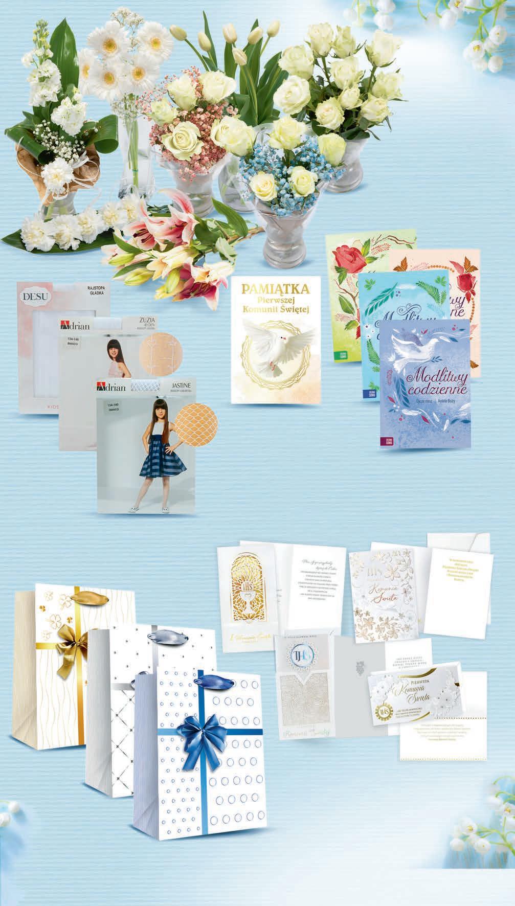 TANIO 9 99 1 szt. Modlitwy codzienne WYDAWNICTWO ZIELONA SOWA wybrane tytuły TANIO 19 99 1 szt. Książka - Pamiątka Pierwszej Komunii Świętej WYDAWNICTWO ZIELONA SOWA CZWARTEK – ŚRODA 20 – 26 kwietnia Torebka prezentowa mix wzorów i kolorów wym. 18 x 23 x 10 cm - 3,99 zł wym. 26 x 32 x 12 cm - 5,99 zł TANIO od 399 1 szt. Rajstopy dziewczęce • 20 DEN, kolor biały - 7,99 zł • 40 DEN, żakardowy wzór - 14,99 zł • z siateczką, kabaretki - 14,99 zł TANIO od 7 99 1 para Ozdobna kartka okolicznościowa z życzeniami komunijnymi DREAM CARDS mix wzorów i kolorów TANIO 7 99 1 szt. Tulipan 7 szt. - 12,99 zł Róża 10 szt. - 17,99 zł Alstromeria 7 szt. - 17,99 zł Lilia 3 szt. - 19,99 zł Goździk 5 szt. - 19,99 zł Eustoma 4 szt. - 22,99 zł Bukiet letni mix - 24,99 zł Bukiet Premium - 39,99 zł TANIO od 1299 1 bukiet od 21.04