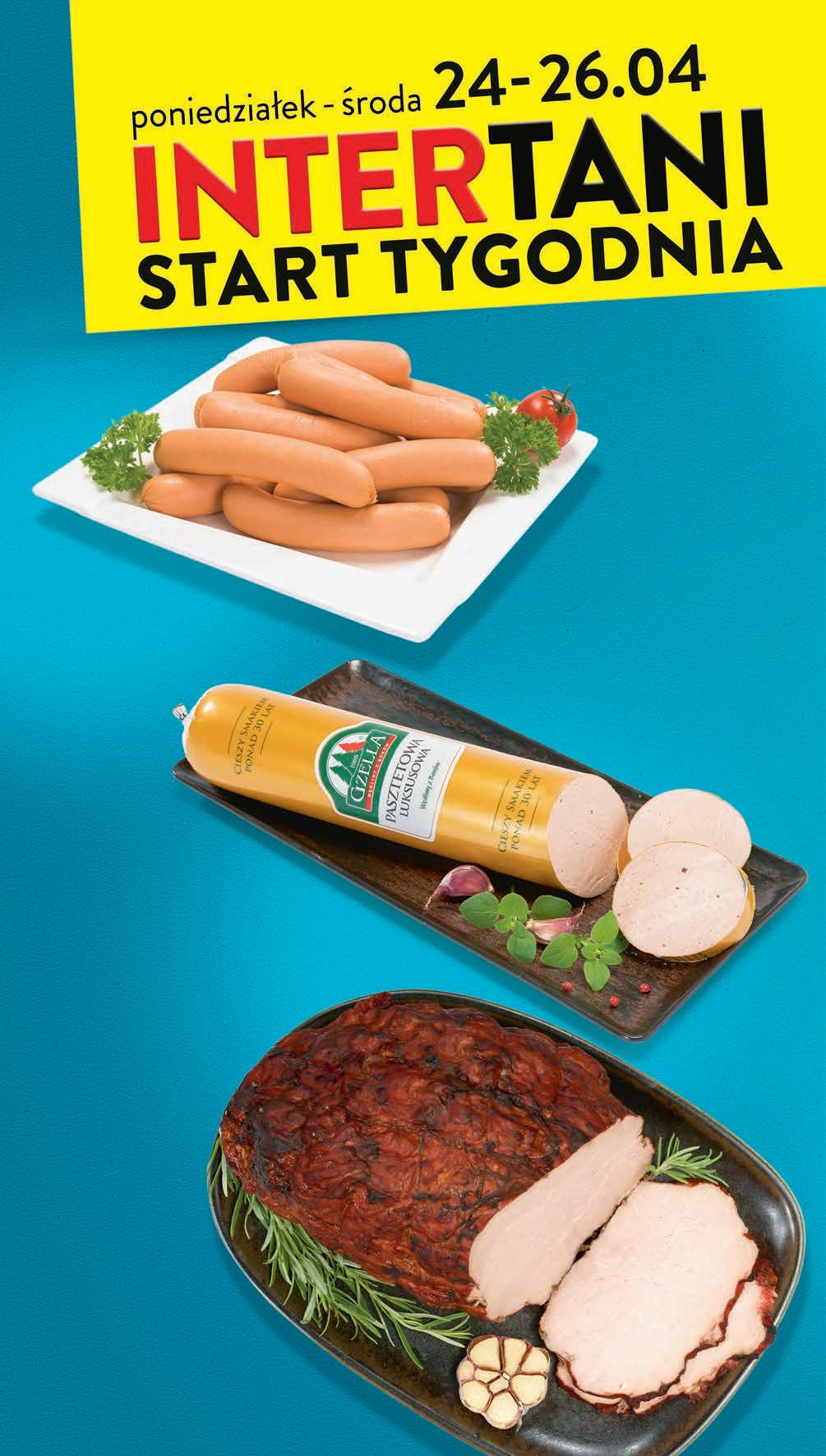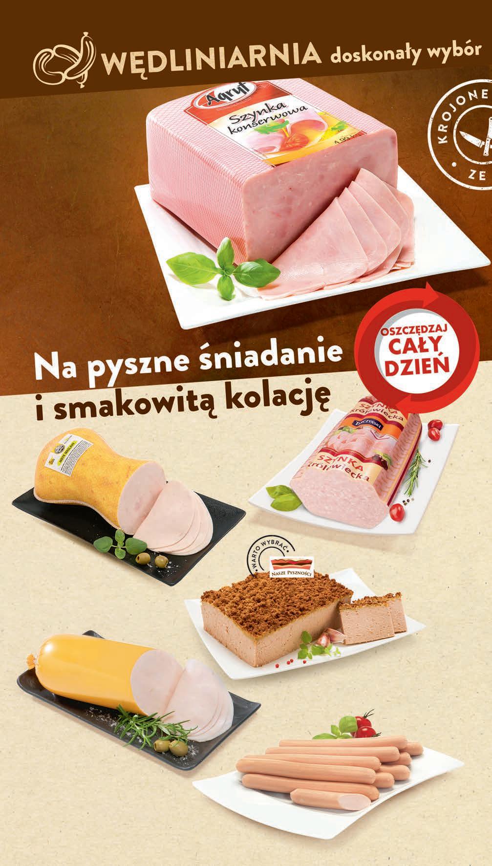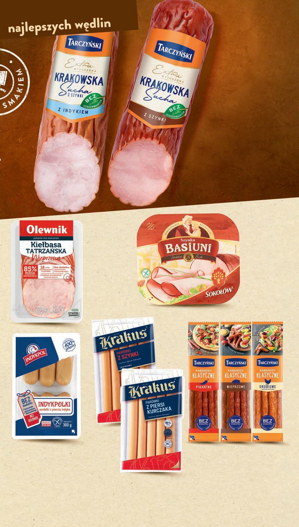 CZWARTEK – ŚRODA 20 – 26 kwietnia Serdelki Indykpolki INDYKPOL Z piersi indyka 300 g, 21,63 zł / 1 kg Parówki KRAKUS wybrane rodzaje 200 g, 27,45 zł / 1 kg Kabanosy klasyczne TARCZYŃSKI wybrane rodzaje 300 g, 36,63 zł / 1 kg Kiełbasa krakowska sucha TARCZYŃSKI wybrane rodzaje 330 g , 39,36 zł / 1 kg 1299 1 szt. 16,49 3,50 zł TANIEJ -21% Kiełbasa tatrzańska OLEWNIK 90 g, 61,00 zł / 1 kg 549 1 opak. 5,99 TANIO 649 1 opak. 6,99 TANIO 549 1 opak. 5,99 TANIO Szynka Basiuni SOKOŁÓW 140 g, 42,79 zł / 1 kg 599 1 opak. 6,89 TANIO TANIO 1099 1 opak.