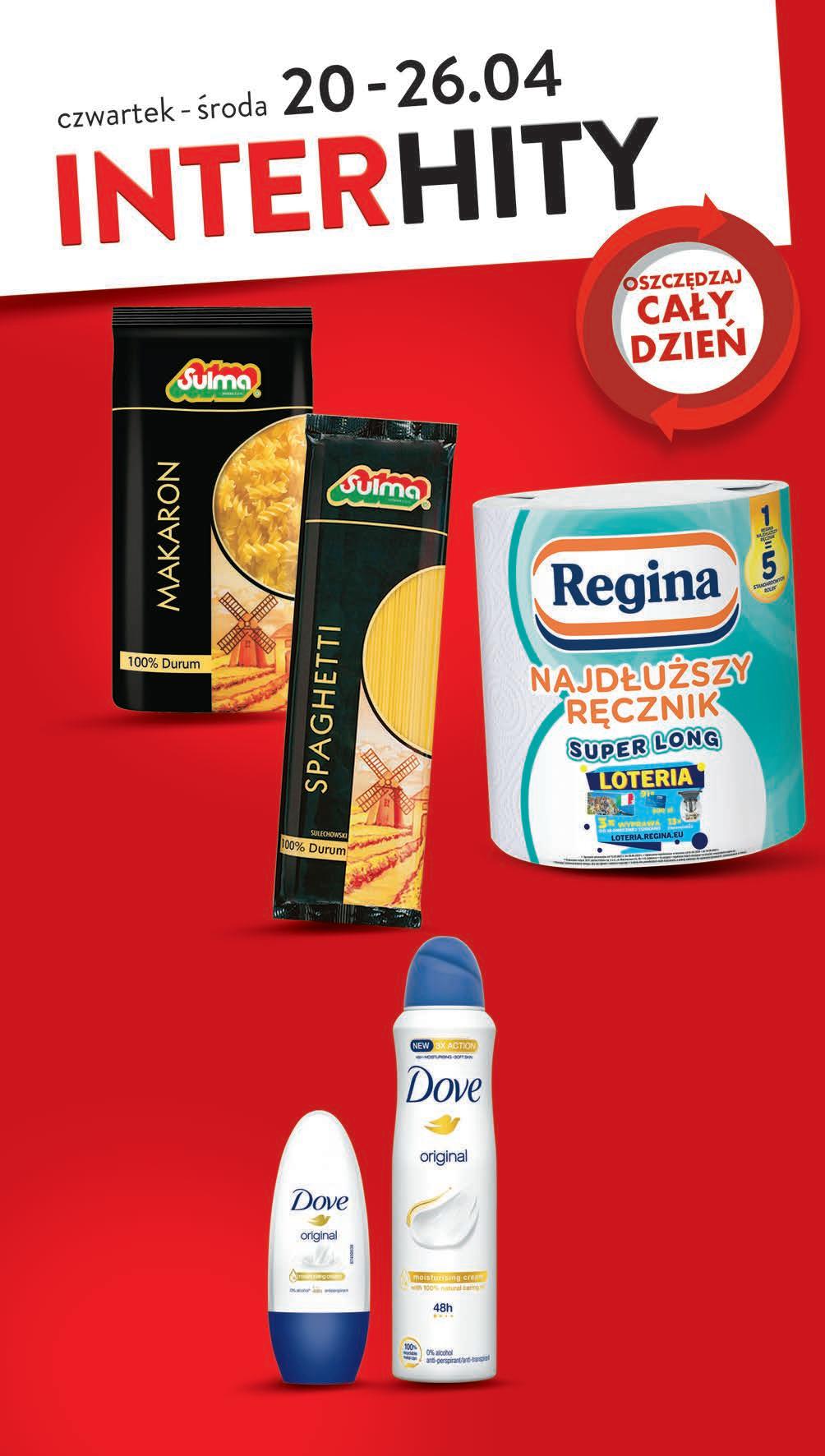 Makaron SULMA wybrane rodzaje 320 - 500 g od 7,98 do 12,47 zł / 1 kg 399 1 opak. drugi produkt -40% przy zakupie 2 opak. 4,99 możliwy MIX rodzajów PROMOCJA 20.04 - 2.05 Ręcznik papierowy REGINA Super Long 1 rolka 1199 1 szt. 14,95 2,96 zł TANIEJ Najniższa cena z 30 dni przed promocją 14,39 zł / 1 szt. Dezodorant DOVE spray 150 ml roll-on, 50 ml wybrane rodzaje od 7,99 do 23,98 zł / 100 ml możliwy MIX rodzajów 1199 1 szt. przy zakupie 2 szt. do 15,49 drugi produkt 45% do