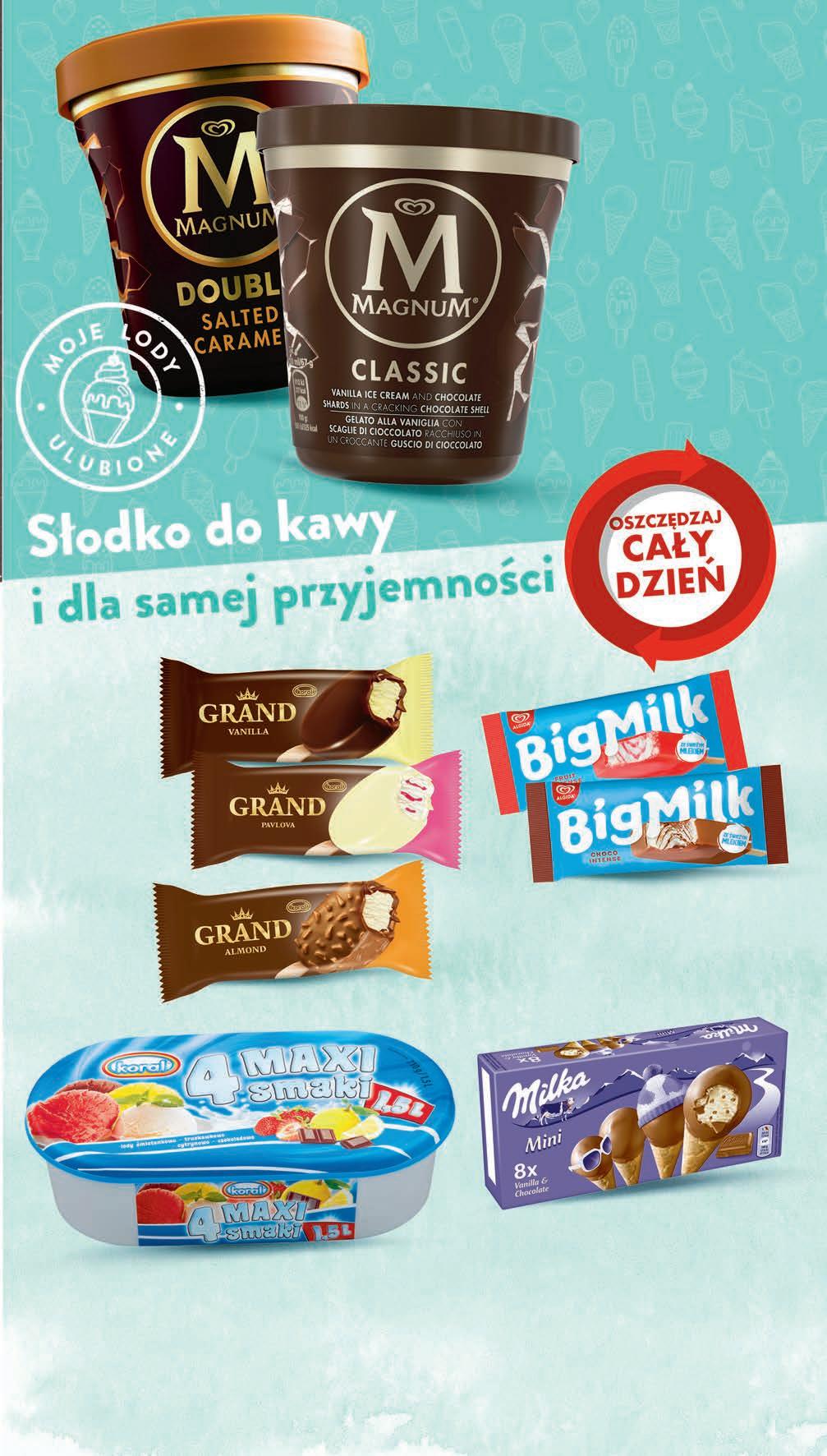 CZWARTEK – ŚRODA 20 – 26 kwietnia Lody GRAND wybrane rodzaje 120 ml, 24,92 zł / 1 l 299 1 szt. przy zakupie 3 szt. 4,49 2+1 GRATIS możliwy MIX rodzajów Lody BIG MILK INTENSE wybrane rodzaje 100 ml, 32,90 zł/ 1 l 329 1 szt. 3,99 TANIO Lody MAGNUM wybrane rodzaje 0,44 l, 43,16 zł / 1 l 1899 1 szt. 23,49 4,50 zł TANIEJ Lody MILKA Mini 8 x 25 ml 64,95 zł / 1 l 12998-pack 15,99 3 zł TANIEJ Lody 4 Maxi Smaki KORAL wybrane rodzaje 1,5 l, 9,99 zł / 1 l 1499 1 szt. do 19,99 do 5 zł TANIEJ do -25%