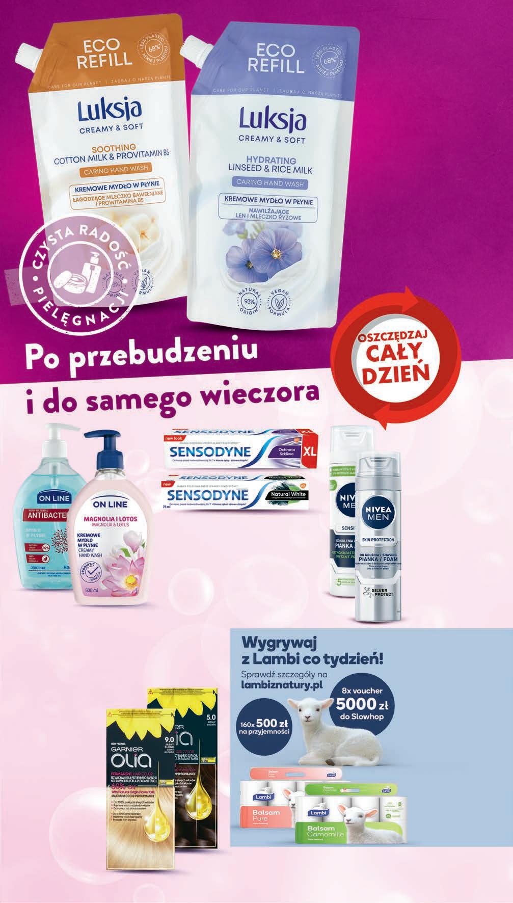 CZWARTEK – ŚRODA 20 – 26 kwietnia możliwy MIX rodzajów Pasta do zębów SENSODYNE wybrane rodzaje 75 - 100 ml od 11,99 do 15,99 zł / 100 ml 1199 1 szt. drugi produkt -49% przy zakupie 2 szt. 15,95 Pianka do golenia NIVEA wybrane rodzaje 200 ml 5,50 zł / 100 ml 1099 1 szt. drugi produkt -42% przy zakupie 2 szt. 13,99 możliwy MIX rodzajów Mydło ON LINE w płynie, z dozownikiem wybrane rodzaje 500 ml, 15,18 zł / 1 l 7 59 1 szt. drugi produkt -21% przy zakupie 2 szt. 8,49 możliwy MIX rodzajów -26% Papier toaletowy LAMBI wybrane rodzaje 8 rolek , 1,87 zł / 1 rolka 1499 1 opak. 16,99 2 zł TANIEJ Najniższa cena z 30 dni przed promocją 16,99 zł / 1 opak. Farba do włosów OLIA wybrane rodzaje 1899 1 opak. 25,99 7 zł TANIEJ Najniższa cena z 30 dni przed promocją 25,99 zł / 1 opak. Mydło w płynie LUKSJA zapas wybrane rodzaje 400 ml, 9,98 zł / 1 l możliwy MIX rodzajów 399 1 szt. drugi produkt -53% przy zakupie 2 szt. 5,45