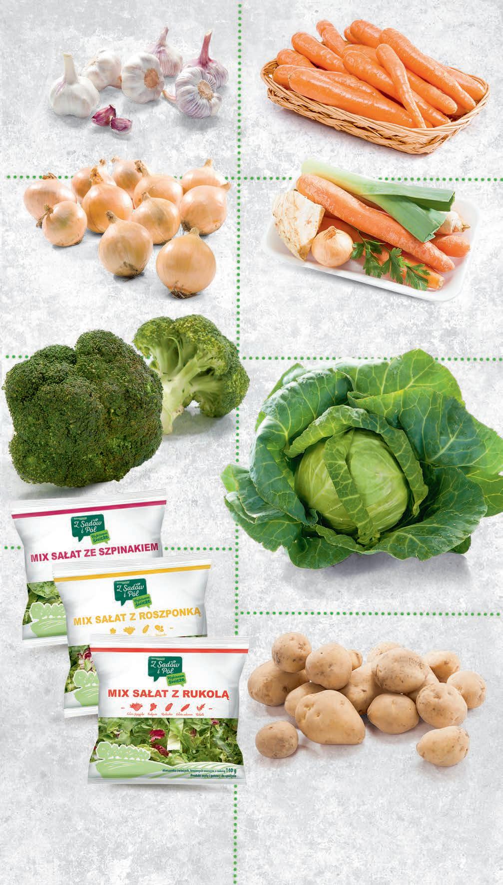 TANIO 499 1 kg Marchew luz TANIO 499 1 szt. Kapusta młoda TANIO 499 1 szt. Brokuł TANIO 249 100 g Czosnek luz TANIO 699 1 opak. Włoszczyzna Z SADÓW I PÓL tacka, 650 g 10,75 zł / 1 kg TANIO 179 1 kg Ziemniaki luz TANIO 599 1 kg Cebula luz TANIO od 349 1 opak. Mix sałat Z SADÓW I PÓL • porcja na raz, 2 x 50 g - 3,49 zł • z rukolą, 140 g - 4,49 zł • z sałatą lodową, 160 g - 4,49 zł • z roszponką, 120 g - 4,49 zł • ze szpinakiem, 120 g - 4,49 zł od 2,81 do 3,49 zł / 100 g CZWARTEK – ŚRODA 20 – 26 kwietnia