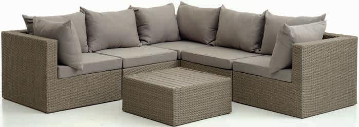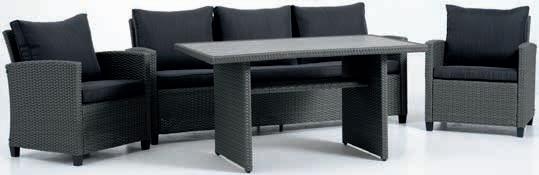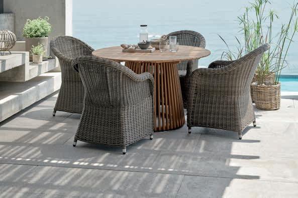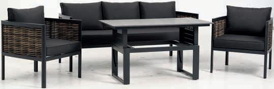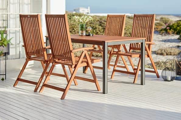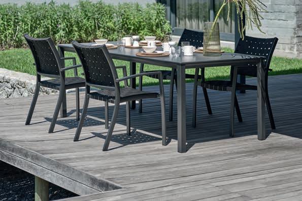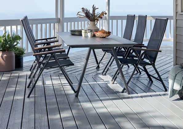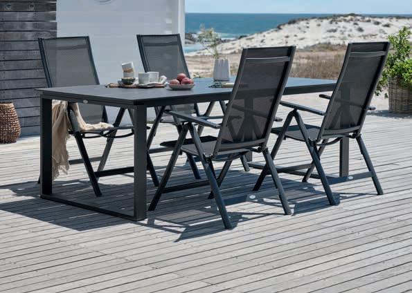 Stół: Aluminium i drewno syntetyczne. S100 x D220 x W74 cm. Krzesło: Aluminium i tekstylen. 6-pozycyjne. Składane.