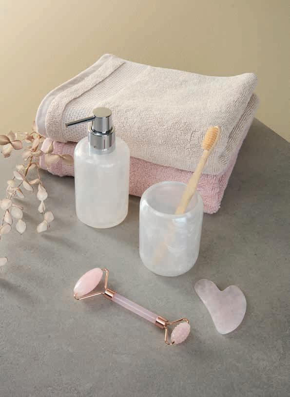 1) MASAŻER DO TWARZY VALLSTA W zestawie masażer do twarzy i kamień do masażu. 2) DOZOWNIK MYDŁA LISTERBY Poliżywica. Ś7 x W15 cm 3) RĘCZNIK NORA 100% bawełna. Miękka, gruba i wyjątkowo chłonna. 600 g/m². 50x100 cm 4) STOJAK NA SZCZOTECZKI DO ZĘBÓW LISTERBY Poliżywica. Ś7 x W10 cm