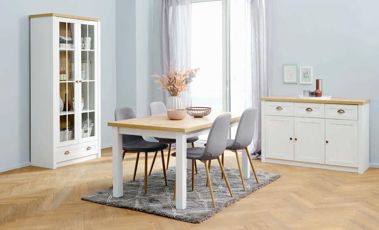 Stół: Lity buk i okleina. Z 1 blatem dodatkowym, który można przechowywać pod stołem. S90 x D150/193 x W75 cm. Krzesło: Tkanina i stal.