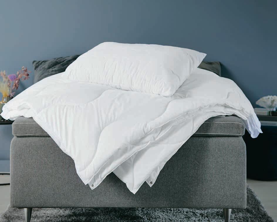 Praktyczna kołdra składająca się z 2 kołder spiętych guzikami. Przewiewny wsad z silikonowanego, spiralnego włókna rurkowego z recyklingu, 400/800 g. Miękkie poszycie w 100% z mikrowłókna poliestrowego. Pranie 60°C. 135x200 cm 1 SZT. 269,-