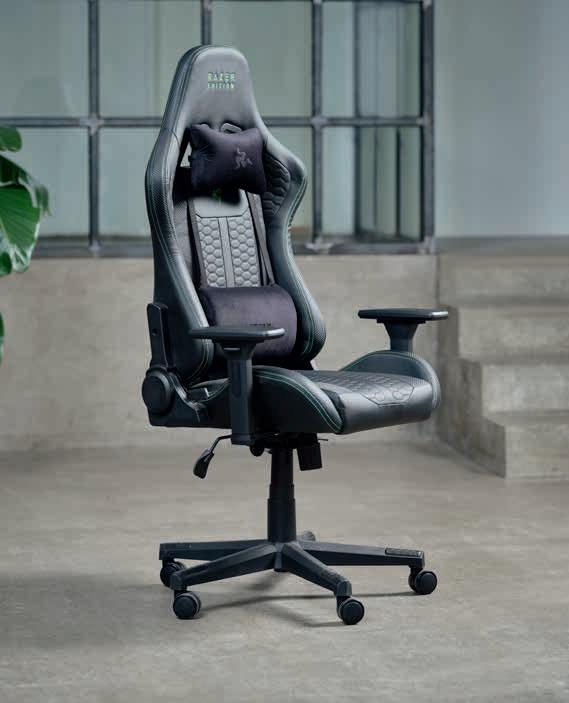 KRZESŁO GAMINGOWE TYPE Z – RAZER EDITION™ BY LEGEND Skóra ekologiczna. Poduszki dodatkowo wspierające odcinek lędźwiowy i ramiona. Poduszka pod kark z redukującą napięcie pianką termoelastyczną. Regulowane podłokietniki, bezstopniowa regulacja przechyłu i wysokości. Ś70 x W126-136 x G70 cm 1 SZT.