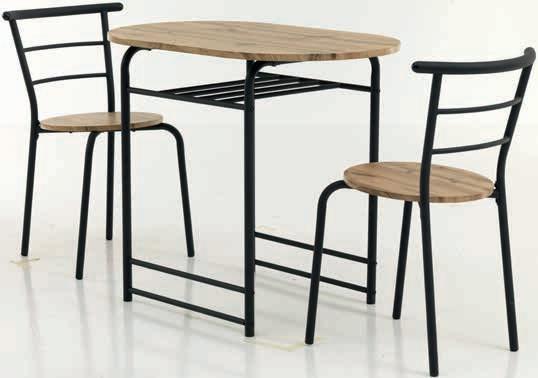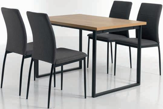 Stół: Okleina i stal. S80 x D120 x W75 cm. Krzesło: Tkanina i stal.