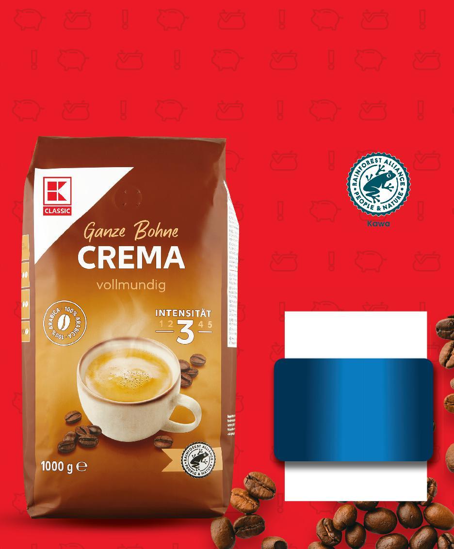 KAŻDY Z NAS OSZCZĘDZA! Z KAUFLAND CARD ZAWSZE TANIO! MARKI NASZE, CZĘDNOŚCI WASZE! * Cena naliczana przy kasie. cena bez karty najniższa cena z 30 dni przed obniżką 46,99 46,99 e 34,99* -25% Z KARTĄ KAWA OD CZW. 3.08 DO ŚR. 9.08 (z kartą =100 G 3,50) (bez karty =100 G 4,70) Kawa ziarnista Crema 1000 g opakowanie S11-PL-KW31-LFT-SUPOFERTA_RE-1020-10 11