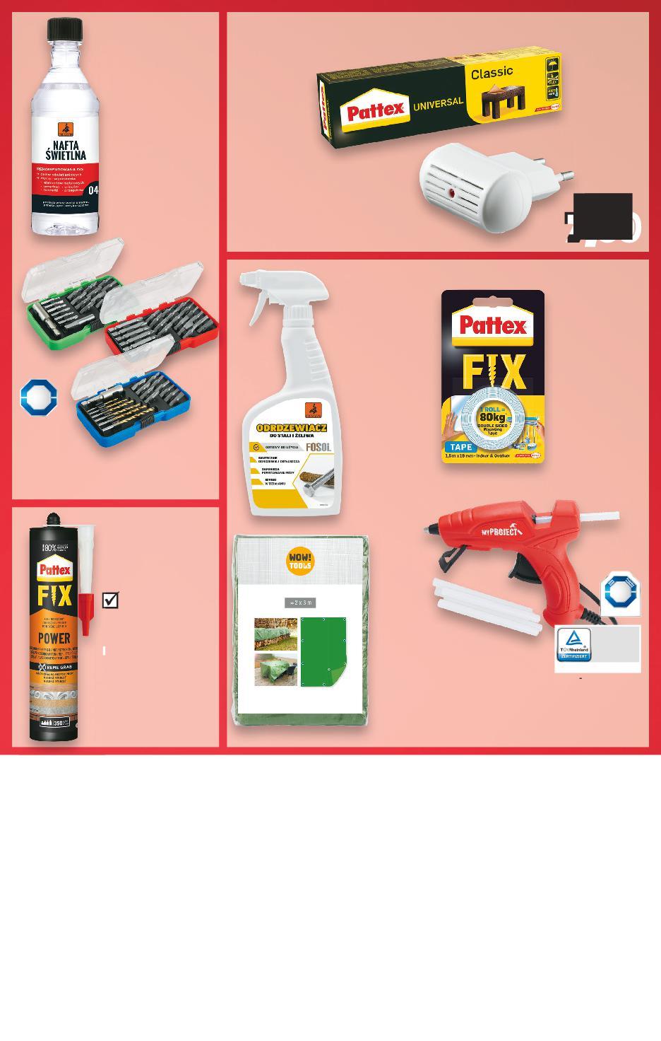 dł. przewodu 1,5 m, 6 wkładów w zestawie 15,00 tylko Plandeka z oczkami odporna na rozdarcie i promieniowanie UV wym. 2 m x 3 m PATTEX Klej montażowy Fix Extreme Power przyczepność po 1 s (=100 G 5,19) 385 g po 1 s G 20,00 tylko 15,00 tylko PATTEX Taśma klejąca dwustronna montażowa, do wnętrz i na zewnątrz dł. 1,5 m 15,00 tylko DRAGON Odrdzewiacz do stali atomizer (=1 L 30,00) 0,5 litra 17 elementów ZŁOTYCH 20 ZŁOTYCH 15 ZŁOTYCH 7 ZŁOTYCH 10 01