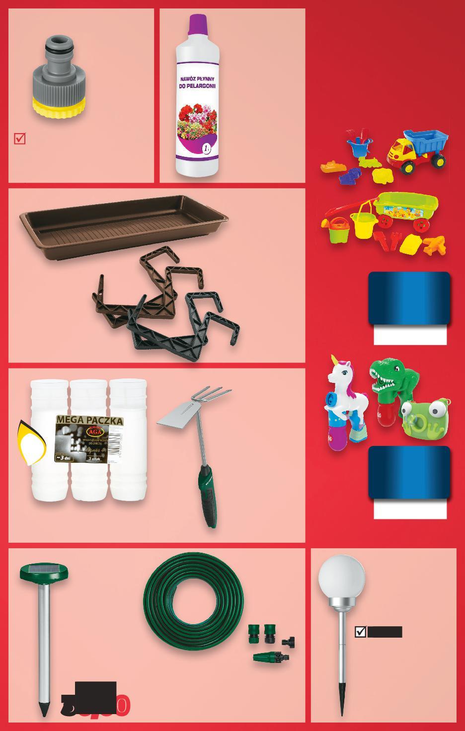 ** Oferta poza stałym asortymentem, dostępna wyłącznie do wyczerpania zapasów. Cena naliczana przy kasie. Oferta ważna od 3.08.2023 do 9.08.2023, chyba że na stronach gazety wskazano inaczej, lub do wyczerpania zapasów. Artykuł może zostać wyprzedany w pierwszych dniach obowiązywania oferty ze względu na ograniczone zapasy. Wszystkie podane ceny wyrażone są w złotych polskich. Artykuły sprzedawane są bez dekoracji. Sprzedaż w ilościach detalicznych. 1,00 tylko COUNTRYSIDE® Przyłącze kranowe 1/2" i 3/4" 3,00 tylko COUNTRYSIDE® Uchwyty do skrzynki na kwiaty różne kolory (=1 SZT. 1,50) 3,00 tylko COUNTRYSIDE® Podstawka pod skrzynkę dł. 40 cm cena bez karty 50,00 n 30,00** tylko Z KARTĄ cena bez karty 30,00 n 20,00** tylko Z KARTĄ KIDLAND® Pistolet do baniek mydlanych poj. 150 ml, różne wzory od 3 r.ż. Wywrotka Active z akcesoriami do piasku 8 elementów lub Wózek z akcesoriami do piasku 8 elementów 7,00 tylko Nawóz płynny do pelargonii 1 litr 2 sztuki 10,00 tylko Wkłady parafinowe (=1 SZT. 3,33) 72 h 10,00 tylko PARKSIDE® Podwójna motyka krótki trzonek 3 sztuki 15,00 tylko COUNTRYSIDE® Lampa solarna 2 diody LED, w zestawie wspornik balkonowy, do 8 h pracy śr. 15 cm solarna 2 LED, w zestawie do 8 śr cm 30,00 tylko PARKSIDE® Solarny odstraszacz kretów PSMS1 płoszy krety, norniki i ryjówki za pomocą fal o niskiej częstotliwości i/lub wibracji norniki i ryjówki za pomocą fal o niskiej i/lub wibracji 30,00 tylko PARKSIDE® Wąż ogrodowy odporny na działanie czynników atmosferycznych, maks. ciśnienie 6 bar, akcesoria w zestawie, różne rodzaje 3 elementy dł. 20 m ZŁOTY 1 ZŁOTYCH 7 ZŁOTE 3 ZŁOTYCH 10 ZŁOTYCH 30 KAŻDY Z NAS OSZCZĘDZA! Z KAUFLAND CARD ZŁOTYCH 15 S51-PL-KW31-LFT-NF_GRUPY_RE-1020-10 51