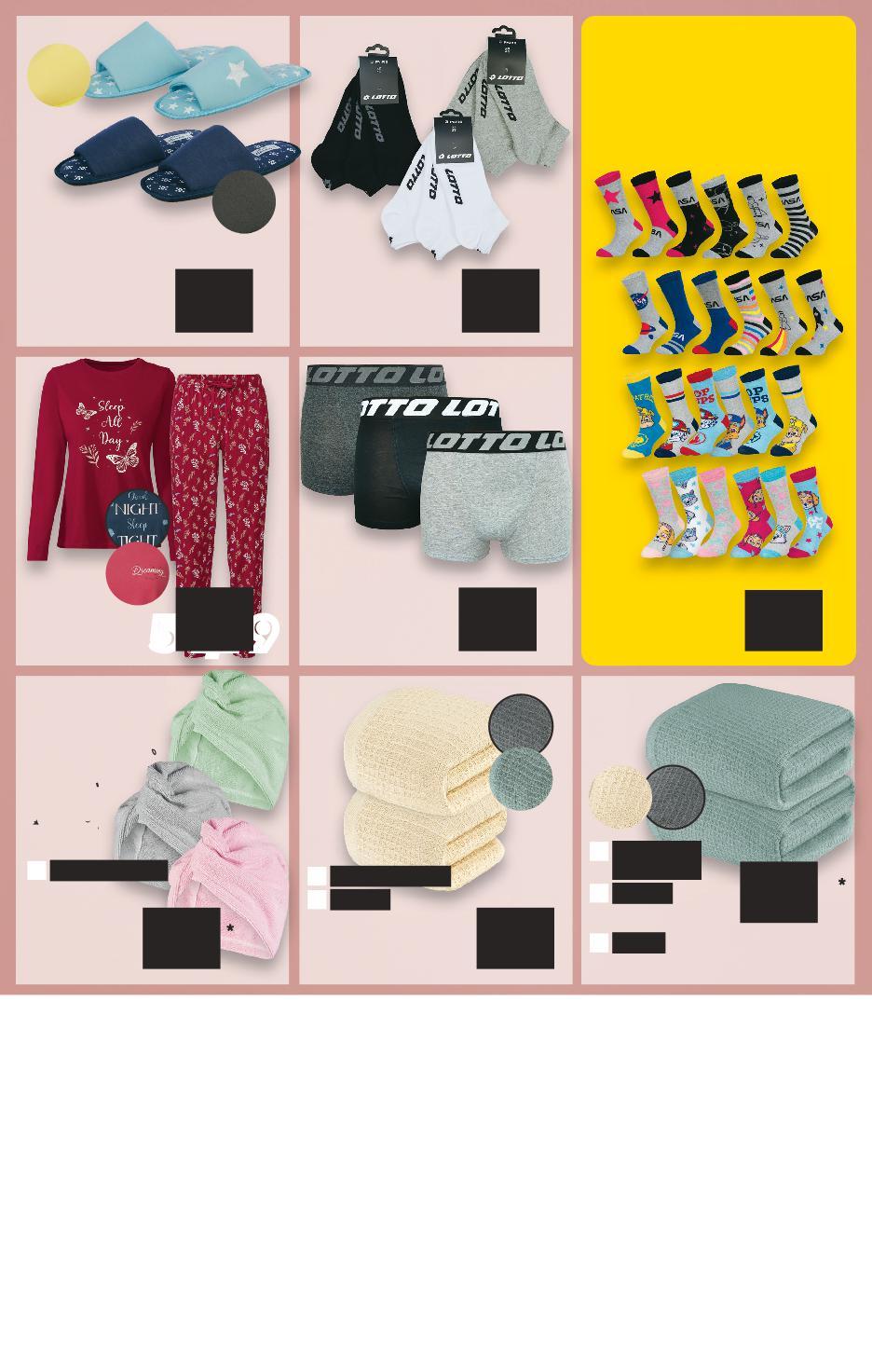 3 pary STEP BY STEP Kapcie damskie rozm. 37–41 męskie rozm. 41–45, z odkrytymi palcami OYANDA Piżama damska różne kolory, rozm. 36–46 wym. 21 x 60 cm Turban na głowę z guzikiem, z mikrofibry, różne kolory NASA PAW PATROL Skarpety dziecięce rozm. 23–34 (=1 PARA 4,33) 3 pary GRATIS KUP 2+1 Ręczniki różne kolory Ręczniki różne rodzaje i kolory (=1 SZT. 15,00) wym. 50 x 100 cm 2 sztuki (=1 SZT. 5,00) wym. 30 x 50 cm 2 sztuki wym. 70 x 100 cm 29,99 sztuka 12,99 01