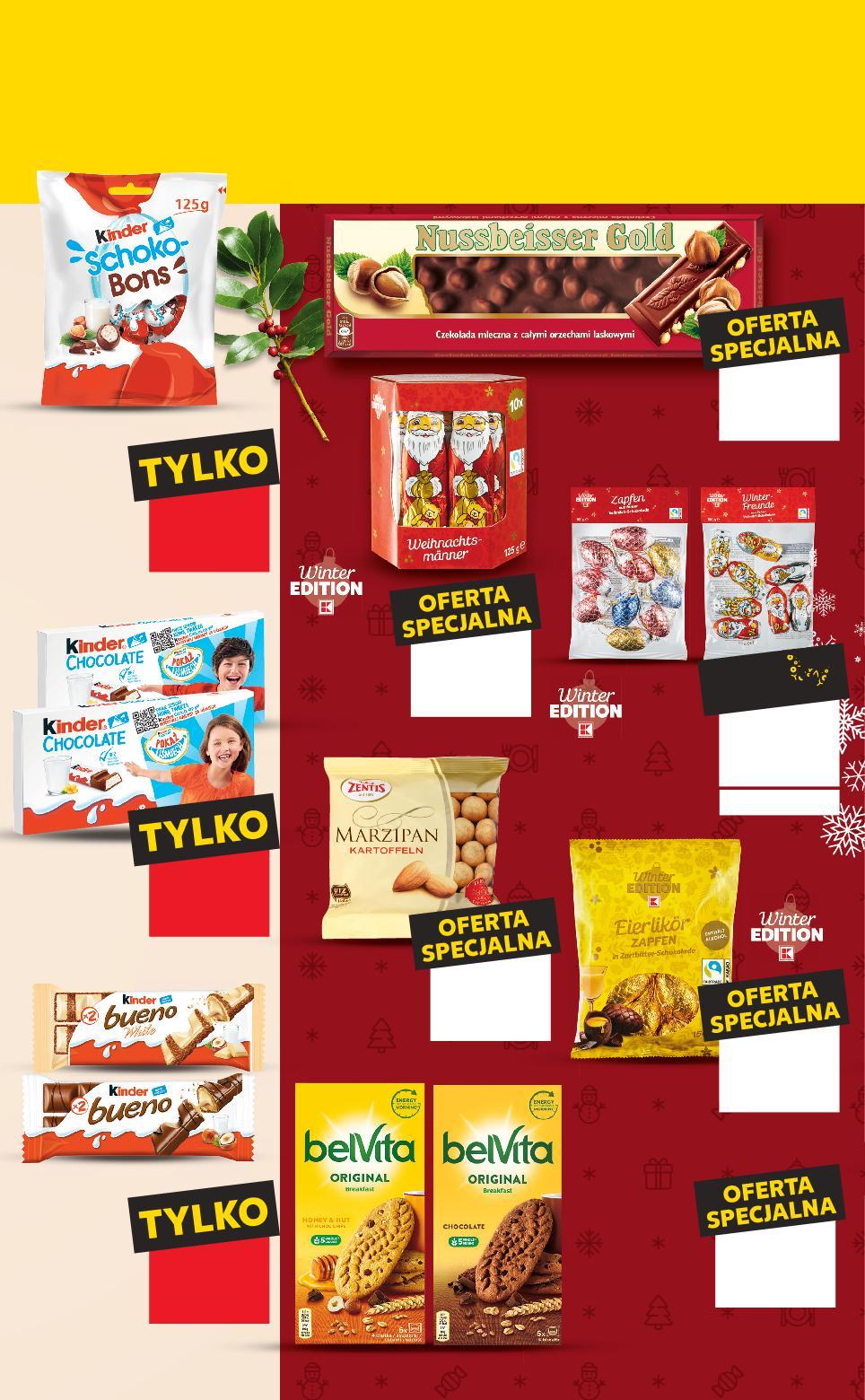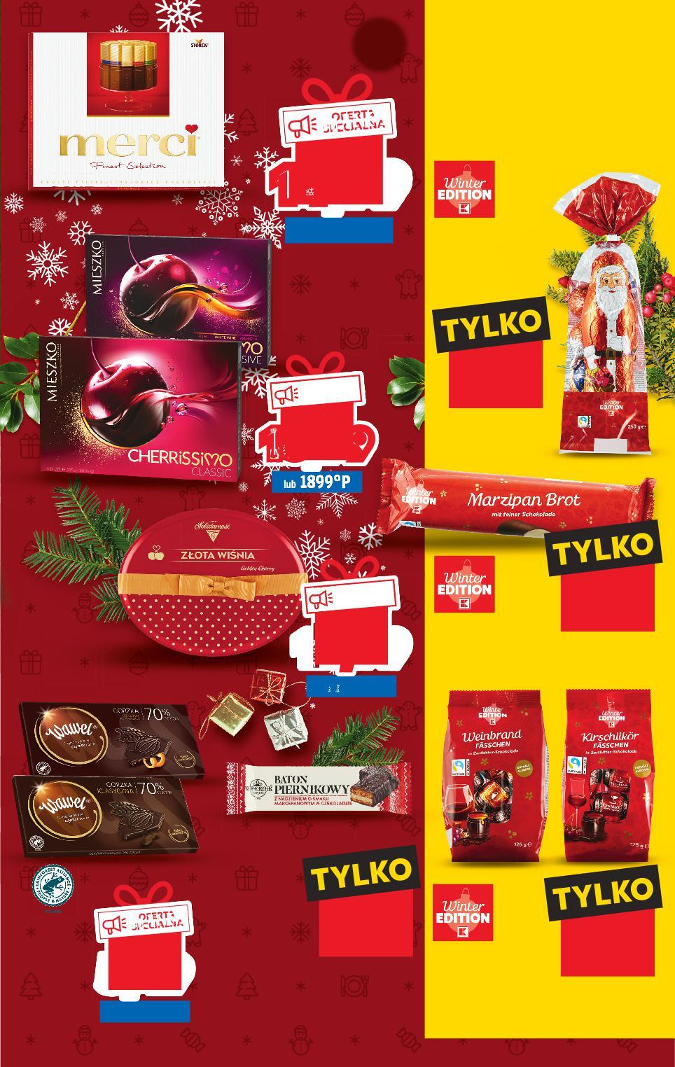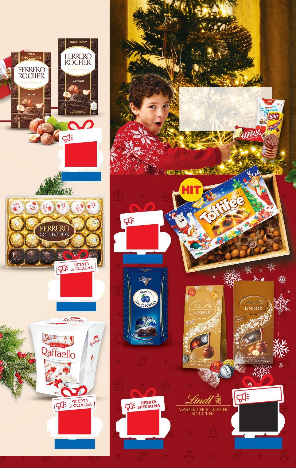 ŚWIĄTECZNE SŁODYCZE OD CZWARTKU 8.12 GDZIE SŁODKIE ŻYCZENIA DO SPEŁNIENIA MAM? lub 999°P 9,99 -9% 10,99 lub 799°P OFERTA SPECJALNA tylko 7,99 lub 2499°P OFERTA SPECJALNA tylko 24,99 lub 1099°P TANIO tylko 10,99 lub 2499°P OFERTA TANIO -37% 39,99 24,99 lub 1499°P TANIO -16% 17,99 14,99 FERRERO RAFFAELLO Praliny kokosowe 230 g opakowanie (=100 G 6,52) LINDOR Pralinki czekoladowe różne rodzaje 100 g opakowanie STORCK Toffifee domek 375 g sztuka (=100 G 6,67) FERRERO COLLECTION Bombonierka 269 g opakowanie (=100 G 9,29) SOLIDARNOŚĆ Złota Wiśnia w likierze Śliwka Nałęczowska w czekoladzie 190 g opakowanie (=100 G 5,79) FERRERO ROCHER Czekolada mleczna lub gorzka 90 g opakowanie (=100 G 8,88) Więcej w gazecie online Cukierki, batoniki, wafle, ciastka… Mamy mnóstwo sposobów na osłodzenie Twojego życia! ciastka… Mamy mnóstwo S34-PL-KW49-LFT-BN_slodycze_LI-1020-10 34
