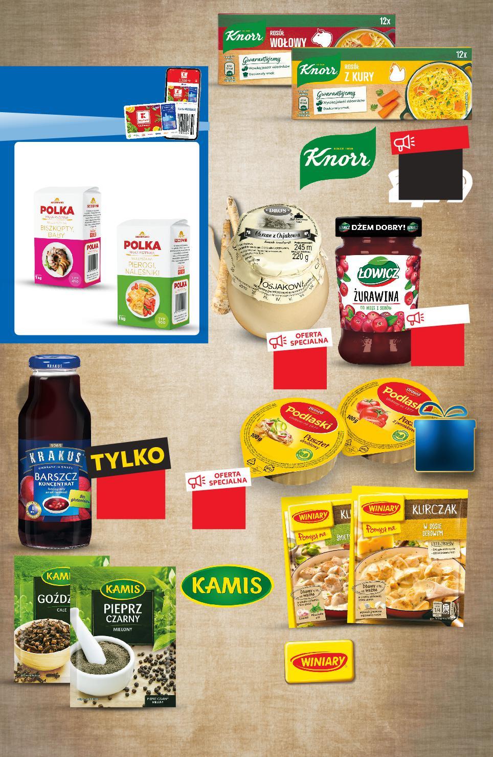 ABC KUCHNI OD CZWARTKU 8.12 2,99 -16% 3,59 OFERTA SPECJALNA tylko 6,99 -25% 7,99 5,99 -22% 1,79 1,39 przy zakupie 2 szt. /sztuka cena regularna Rabat naliczany przy kasie. 3,99 -11% 4,49 KUP 2 MNIEJ ZAPŁAĆ KUP 2 MNIEJ ZAPŁAĆ KUP 3 MNIEJ ZAPŁAĆ przy zakupie 3 szt. /sztuka cena regularna 2,49 2,99 -16% Rabat naliczany przy kasie. przy zakupie 2 szt. /sztuka cena regularna 1,39 1,69 -17% Rabat naliczany przy kasie. KRAKUS Barszcz koncentrat 300 ml butelka (cena prom. =100 ML 13,30) (cena reg. =100 ML 14,97) KNORR Rosół lub Bulion w kostkach, wybrane rodzaje 120 g opakowanie (=100 G 2,50) POLKA Mąka pszenna różne rodzaje 1 kg opakowanie ŁOWICZ Żurawina do mięs 280 g słoik (=100 G 2,50) DROSED Pasztet podlaski różne smaki 100 g opakowanie DROS Chrzan z Osjakowa 220 g słoik (=100 G 2,73) WINIARY Pomysł na... wybrane rodzaje 28–69 g opakowanie (cena prom. =100 G 8,89–3,61) (cena reg. =100 G 10,68–4,33) (cena prom. =100 G 17,38–6,95) (cena reg. =100 G 21,13–8,45) KAMIS Przyprawa wybrane rodzaje 8–20 g opakowanie PARTNER TYGODNIA WIĘCEJ punktów – więcejOSZCZĘDNOŚCI z PAYBACK Zapłać punktami 139°P 10x * S32-PL-KW49-LFT-NMP_LI-1020-10 32