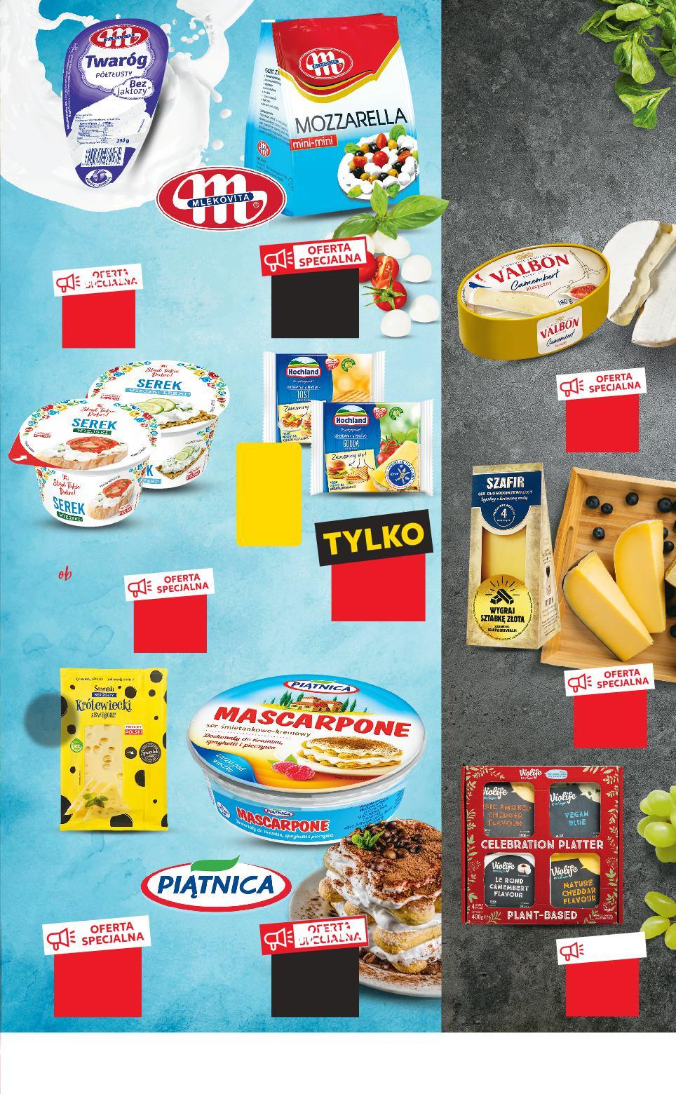 Oferta ważna od 8.12.2022 do 14.12.2022, chyba że na stronach gazety wskazano inaczej, lub do wyczerpania zapasów. Sprzedaż w ilościach detalicznych. Wszystkie podane ceny wyrażone są w złotych polskich. KUP ZAPŁAĆ 2 MNIEJ TANIO -25% 9,99 7,49 -22% 5,79 4,49 -16% 5,99 4,99 -27% 10,99 7,99 -10% 9,99 8,99 OFERTA SPECJALNA tylko 25,99 przy zakupie 2 szt. /sztuka cena regularna Rabat naliczany przy kasie. 3,99 -30% 5,76 TANIO -13% 4,49 3,89 -5% 1,99 1,89 PIĄTNICA Mascarpone 250 g opakowanie (=1 KG 29,96) SERENADA Ser żółty w plastrach, wybrane rodzaje 135 g opakowanie (=1 KG 36,97) VALBON Ser pleśniowy wybrane rodzaje 180/200 g opakowanie (=1 KG 44,39/39,95) MLEKOVITA Mozzarella mini-mini 120 g opakowanie (=1 KG 37,42) VIOLIFE Półmisek serów roślinnych 4 x 100 g opakowanie (=1 KG 64,98) SKARBY SEROWARA Ser twardy półklinek, wybrane rodzaje 180 g opakowanie (=1 KG 49,95) Wszystkich smakoszy zapraszamy na wykwintną ucztę serową! Delektujmy się, zachwycajmy i korzystajmy z życia… Z JAKOŚCIĄ PREMIUM WYJĄTKOWE CHWILE HOCHLAND Ser topiony w plastrach, różne rodzaje 130 g opakowanie (cena prom. =1 KG 30,70) (cena reg. =1 KG 44,31) MLEKOVITA Twaróg półtłusty bez laktozy 230 g opakowanie (=1 KG 16,92) Serek wiejski wybrane rodzaje 200 g opakowanie (=1 KG 9,45) S23-PL-KW49-LFT-FRP_2_RE-1020-10 23