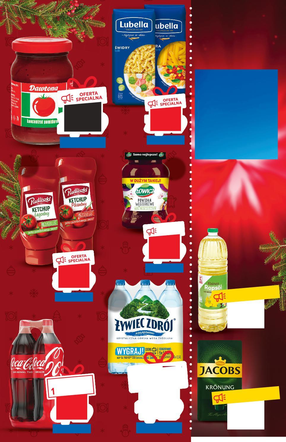 Oferta ważna od 8.12.2022 do 14.12.2022, chyba że na stronach gazety wskazano inaczej, lub do wyczerpania zapasów. Sprzedaż w ilościach detalicznych. Wszystkie podane ceny wyrażone są w złotych polskich. lub 999°P OFERTA SPECJALNA 10,99 9,99 lub 299°P -23% 3,89 2,99 lub 899°P -10% 9,99 8,99 lub 399°P TANIO tylko 3,99 Drodzy Klienci, cieszymy się, że wysoko oceniliście nasze promocje i że dzięki nim zawsze możecie oszczędzać. W podziękowaniu za to, że nas doceniacie, DO KOŃCA GRUDNIA oferujemy poniższe produkty W SUPERCENACH lub 649°P 6,49 7,59 cena reg. 1 butelka KUP 2-PAK ZAPŁAĆ 4% MNIEJ COCA-COLA, FANTA, SPRITE Napój gazowany 2 x 2 l opakowanie (=1 L 3,25) -PAK ZAPŁAĆ ŻYWIEC ZDRÓJ Woda źródlana gazowana, niegazowana, lekko gazowana 6 x 1,5 l butelka (=1 L 1,00) DAWTONA Koncentrat pomidorowy 190 g słoik (=100 G 1,58) ŁOWICZ Powidła węgierkowe 490 g opakowanie (=100 G 2,04) LUBELLA Makaron różne formy 400 g opakowanie (=1 KG 9,98) PUDLISZKI Ketchup łagodny, pikantny 990 g opakowanie (=100 G 0,91) JACOBS KRÖNUNG Kawa mielona 500 g opakowanie (=100 G 5,00) Olej rzepakowy 1 l butelka DZIĘKUJEMY 24,99 tylko DZIĘKUJEMY 8,99 tylko Kaufland laureatem nagrody BLIX AWARDS 2022 Zwycięzca wśród aż 84 SIECI HANDLOWYCH! Więcej na kaufland.pl/blix w kategorii PROMOCJA ROKU. lub 149°P lekko gazowana 6 x l butelka 1,49 2,13 cena reg. 1 butelka KUP 6-PAK ZAPŁAĆ -PAK ZAPŁAĆ 30% MNIEJ % S17-PL-KW49-LFT-supmarki_1_RE-1020-10 17