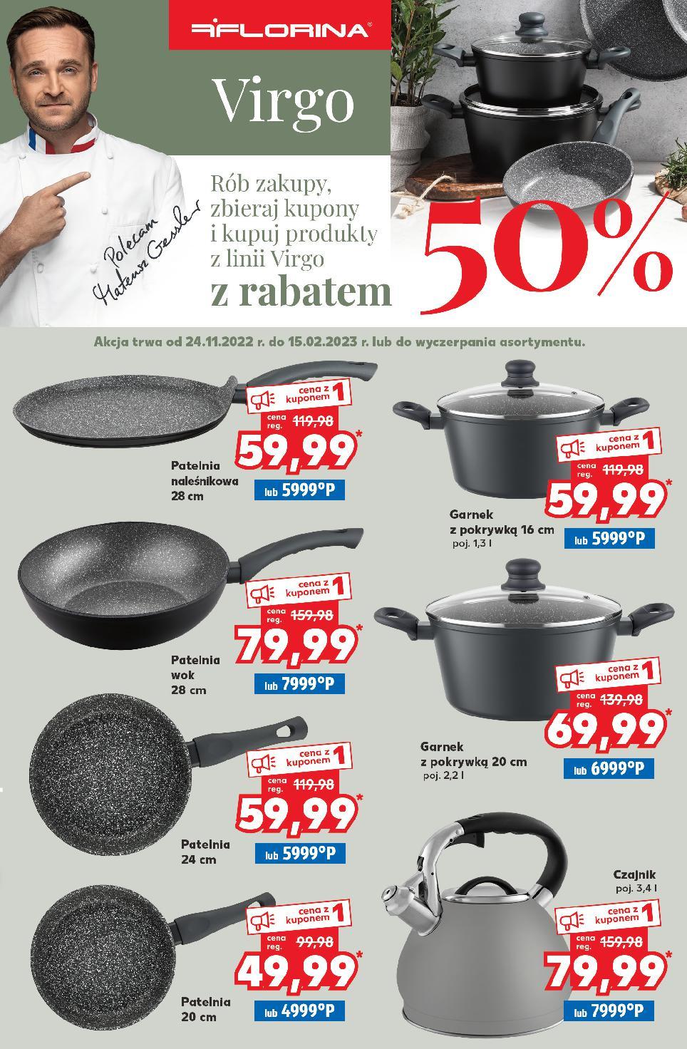 Oferta ważna od 8.12.2022 do 14.12.2022, chyba że na stronach gazety wskazano inaczej, lub do wyczerpania zapasów. Artykuł promocyjny może zostać wyprzedany w pierwszych dniach obowiązywania promocji ze względu na ograniczone zapasy. Wszystkie podane ceny wyrażone są w złotych polskich. Artykuły sprzedawane są bez dekoracji. Sprzedaż w ilościach detalicznych. śr. 26 cm 12 sztuk DAFI Wkład filtrujący Unimax poprawia jakość wody, zapewnia do 200 l czystej wody, pasuje do dzbanków innych producentów 149,90 tylko poj. 2,5 l, śr. 18 cm poj. 4,8 l, śr. 22 cm poj. 1,8 l, śr. 16 cm Zestaw garnków nierdzewnych Oliver do wszystkich rodzajów kuchenek, 3-warstwowe energooszczędne dno, garnek szybko się nagrzewa 8 elementów 109,99 tylko Wkłady filtrujące Unimax XXL 39,99 tylko moc 700 W Opiekacz do kanapek bezpiecznik termiczny, antypoślizgowe nóżki, termoizolacyjny uchwyt i obudowa 54,99 tylko Patelnia Coral Qualum Basic z odkuwanego aluminium, z nieprzywieralną powłoką Qualum Basic, do wszystkich rodzajów kuchenek poj. 1,3 l, śr. 14 cm 129,90 tylko 159,90 tylko RUSSELL HOBBS Wyciskarka Classics 22760-56 funkcja reverse, 2 wymienne stożki RUSSELL HOBBS Czajnik Honeycomb Grey 26053-70 filtr antyosadowy, automatyczny wyłącznik, elementy ze stali nierdzewnej, obrotowa podstawa 360° poj. 1,7 l moc 2400 W moc 60 W 99,99 tylko KALORIK Blender ręczny CMM1010CW z akcesoriami, miksuje, sieka, ubija, dwie prędkości, wymienne końcówki poj. 600 ml moc 400 W 1 szt. 9,17 Dostępny również wkład filtrujący Classic 9,99 tylko WIĘKSZE OPAKOWANIE, NIŻSZA CENA NOWA OFERTA TYGODNIA OD CZWARTKU 8.12 S58-PL-KW49-LFT-NF_4_LI-1020-10 58