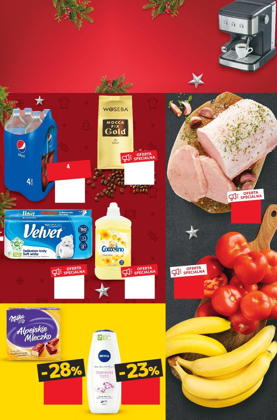 Wydanie 49. Oferta ważna od 8.12.2022 do 14.12.2022, chyba że na stronach gazety wskazano inaczej, lub do wyczerpania zapasów. Zdjęcia produktów zamieszczone na naszych stronach reklamowych mogą się nieznacznie różnić od towarów znajdujących się w sprzedaży. Artykuły sprzedawane są bez dekoracji. Sprzedaż w ilościach detalicznych. Wszystkie podane ceny wyrażone są w złotych polskich. Artykuły prezentowane w gazecie reklamowej oznaczone są w sklepie hasłem Promocja. Pełna oferta na naszej stronie www.kaufland.pl OD CZWARTKU 8.12 DO ŚRODY 14.12 SPRAWDŹ SWOJE PUNKTY PAYBACK, PŁAĆ NIMI I OSZCZĘDZAJ! -27% 21,99 15,99 -40% 9,99 5,99 -25% 15,99 11,99 -28% 13,99 9,99 lub 1699°P -19% 20,99 16,99 3,49 1 butelka tylko KUP -PAK ZAPŁAĆ MNIEJ APŁAĆ lub 14 900°P tylko 149,00 -50% 6,99 3,45 Rabat naliczany przy kasie. przy zakupie 2 szt. /sztuka cena regularna 8,99 13,99 przy zakupie 2 szt. /sztuka cena regularna 9,99 13,99 DRUGI PRODUKT TANIEJ 70% DRUGI PRODUKT TANIEJ 56% KUP 2 ZAPŁAĆ MNIEJ Schab wieprzowy bez kości 1 kg Pomidory luzem 1 kg PEPSI, PEPSI MAX, MIRINDA, 7UP Napój gazowany 4 x 1 l opakowanie (=1 L 3,49) Banany luzem 1 kg COCCOLINO Płyn do płukania wybrane rodzaje 1,8 l opakowanie (=1 L 6,67) VELVET Papier toaletowy 3-warstwowy, wybrane rodzaje 4/8 sztuk opakowanie (=1 SZT. 2,49/1,25) PEPSI OD CZWARTKU 8.12 DO NIEDZIELI 11.12 Rabat naliczany przy kasie. Przy zakupie powyżej 5 kg lub nabyciu na drugi i następne paragony obowiązuje cena regularna. 5 kg maksymalnie na osobę i paragon STOISKO Z OBSŁUGĄ WOSEBA MOCCA FIX GOLD Kawa mielona 500 g opakowanie (=100 G 3,40) EKSPRES DO KAWY NN-CM-01 • moc 850 W • ciśnienie pompki 15 barów • wyjmowany zbiornik na wodę 1,5 l • możliwość jednoczesnego przygotowania dwóch kaw